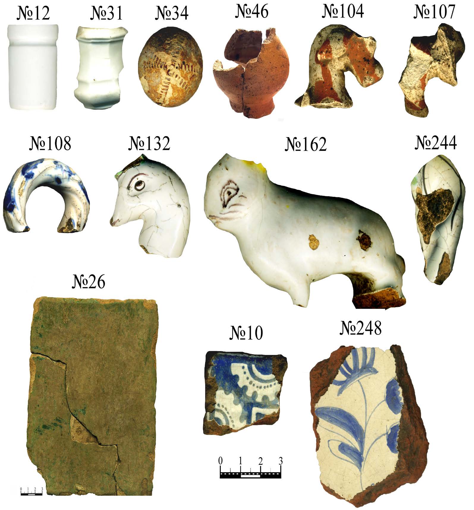 - Предметы из раскопа 2009 г. №№ 6–7 — медный сплав, 10 — фаянс, 12 — кость.