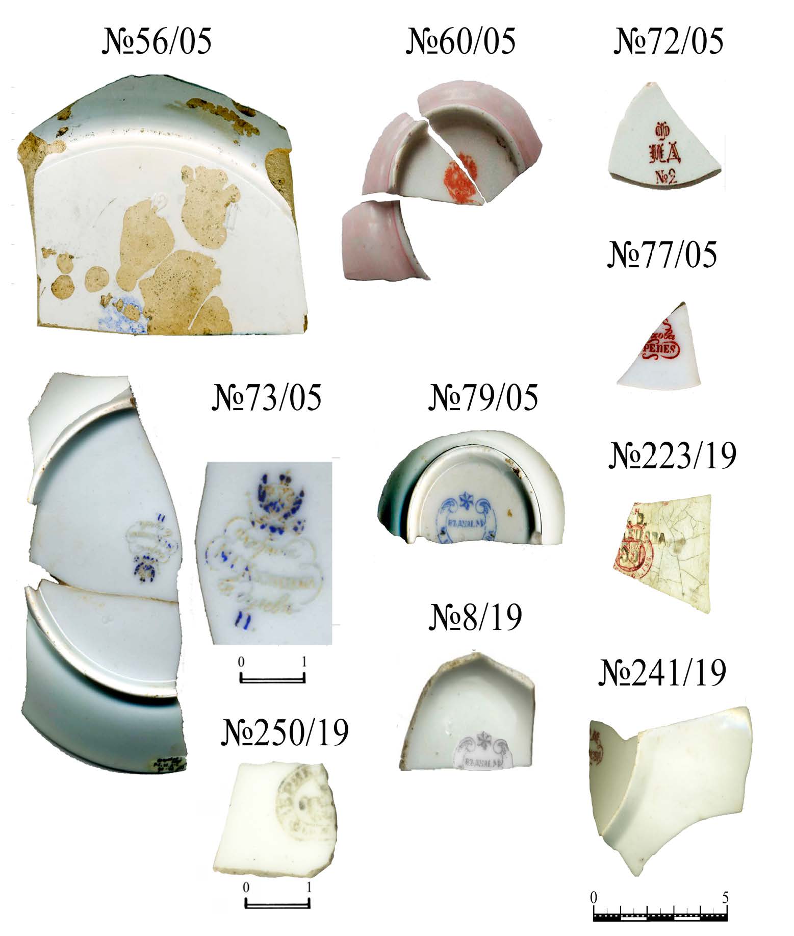 - Клейма на фарфоре и фаянсе, отнесенные ко второй пол. XIХ в. В подписях указаны полевые номера и года раскопок.