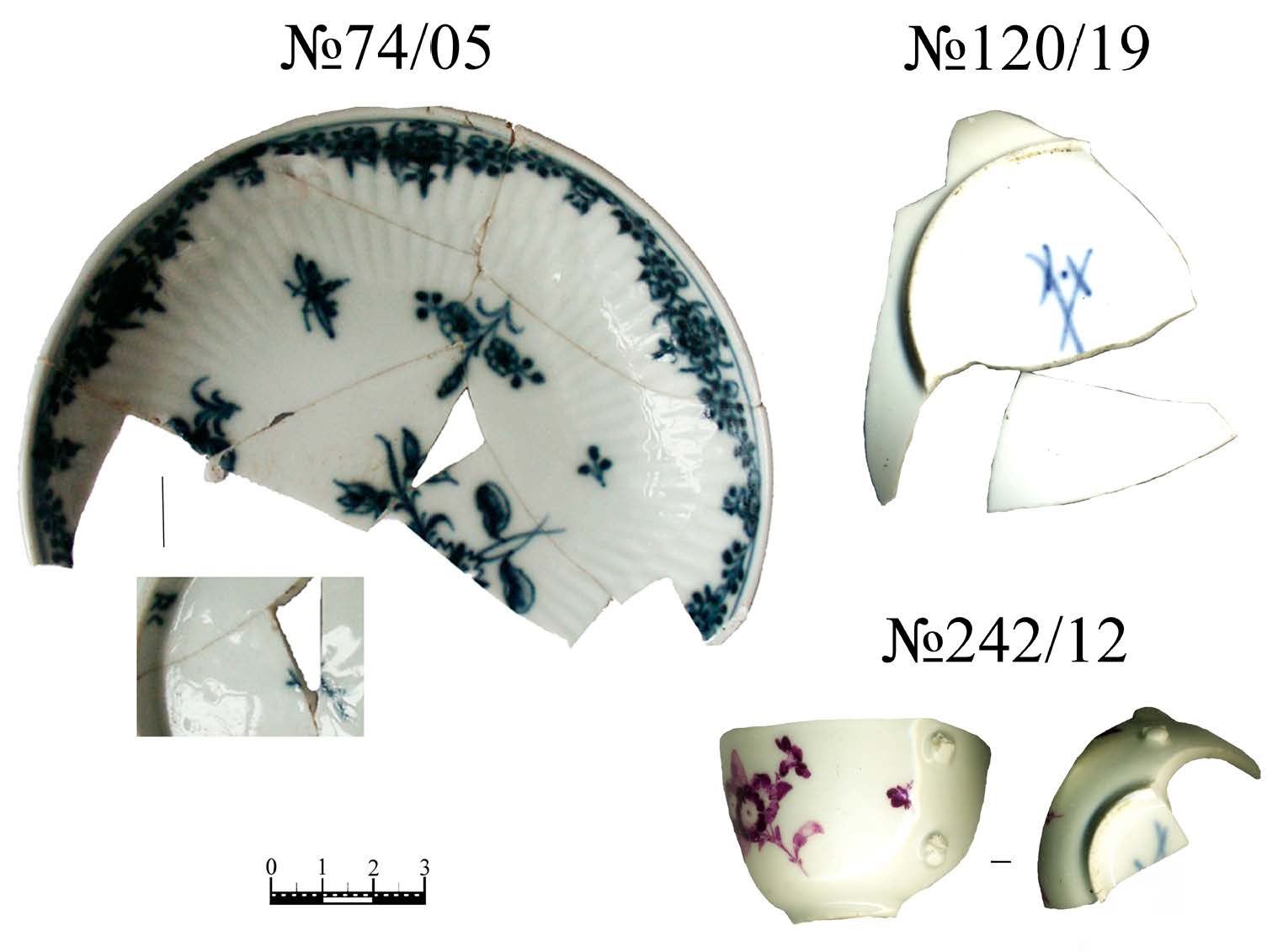 Еще одну группу из трех экземпляров образуют клейма последней четв. XVIII в. (Илл. 5:1–2; Илл. 9). Все они датированы по общему признаку — знаку скрещенных мечей. Все клейма сильно фрагментированы и с равной вероятностью могут быть ранними клеймами Гарднера или Бельведерской фабрики в Варшаве, возможно, один из предметов — оригинальный мейсенский (Илл. 9, № 74/05). Независимо от страны происхождения и завода все эти клейма относятся к одной эпохе.