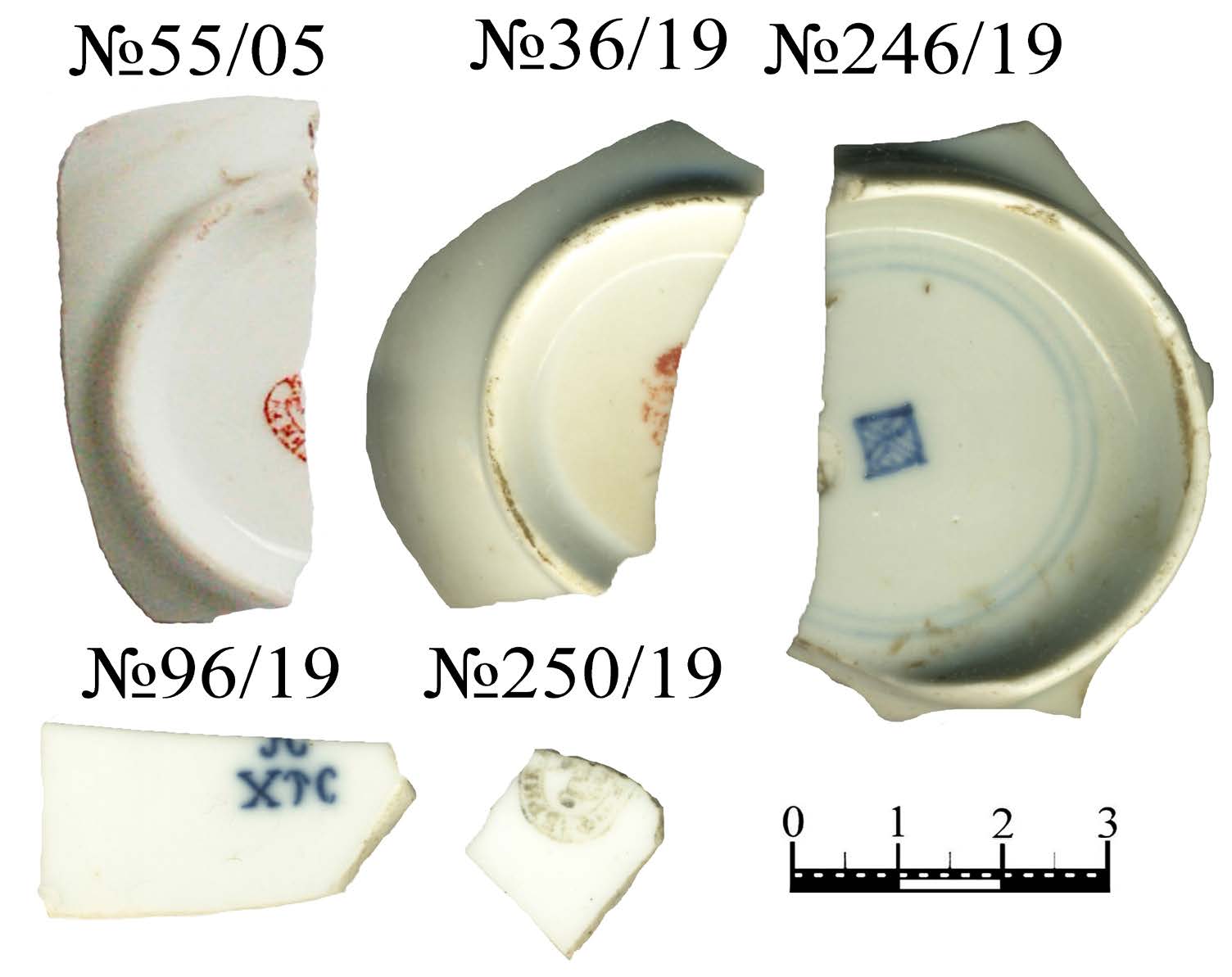 - Клейма на фарфоре и фаянсе, отнесенные ко второй пол. XVIII в. В подписях указаны полевые номера и года раскопок.