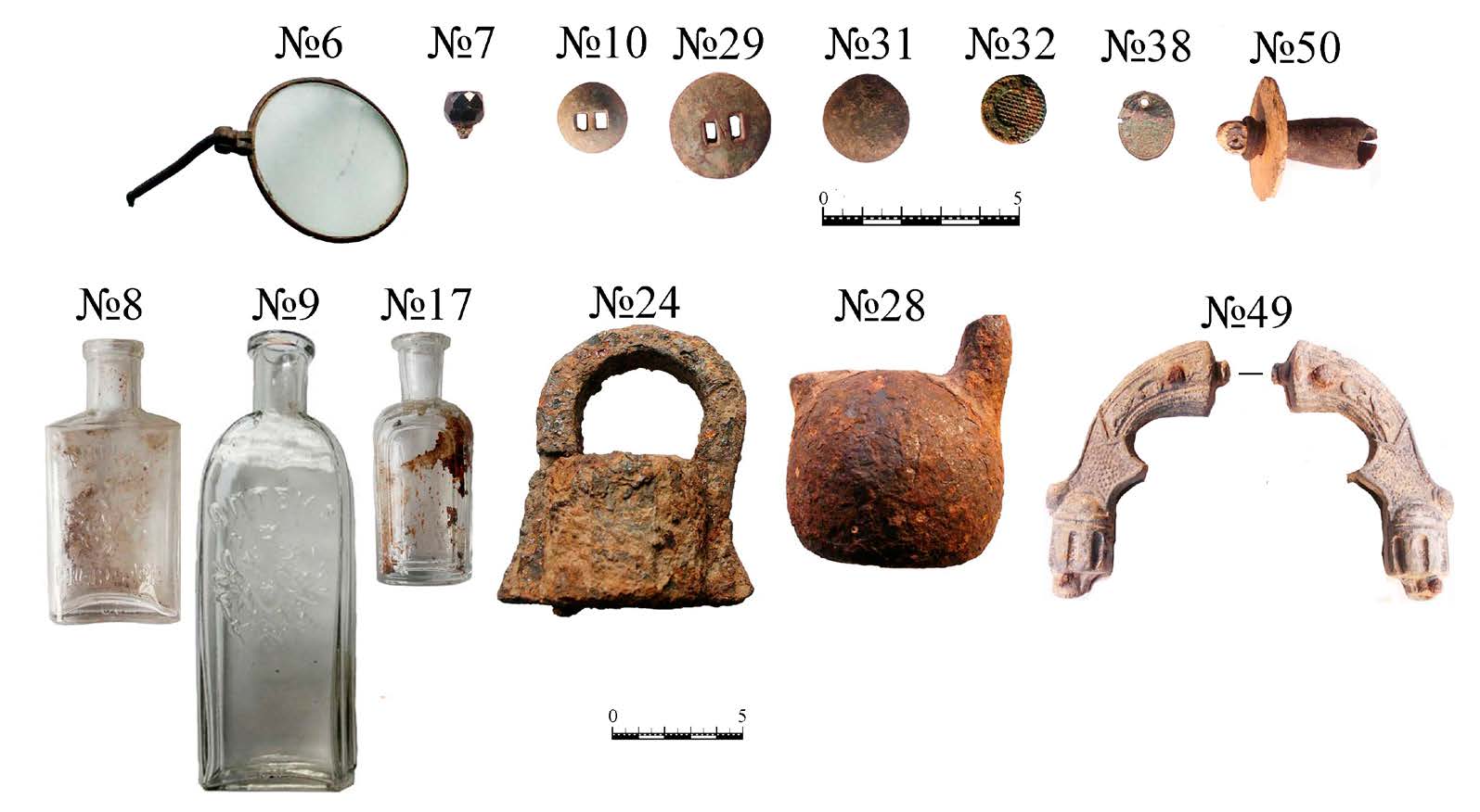 - Предметы из раскопа 2 2005 г. В подписях указаны полевые номера. №№ 6, 7 — черный металл, стекло; №№ 10, 29, 31, 32, 38 — медный сплав; № 50 — резина, кость; №№ 8, 9, 17 — стекло; №№ 24, 28 — черный металл; № 49 — олово, черный металл.