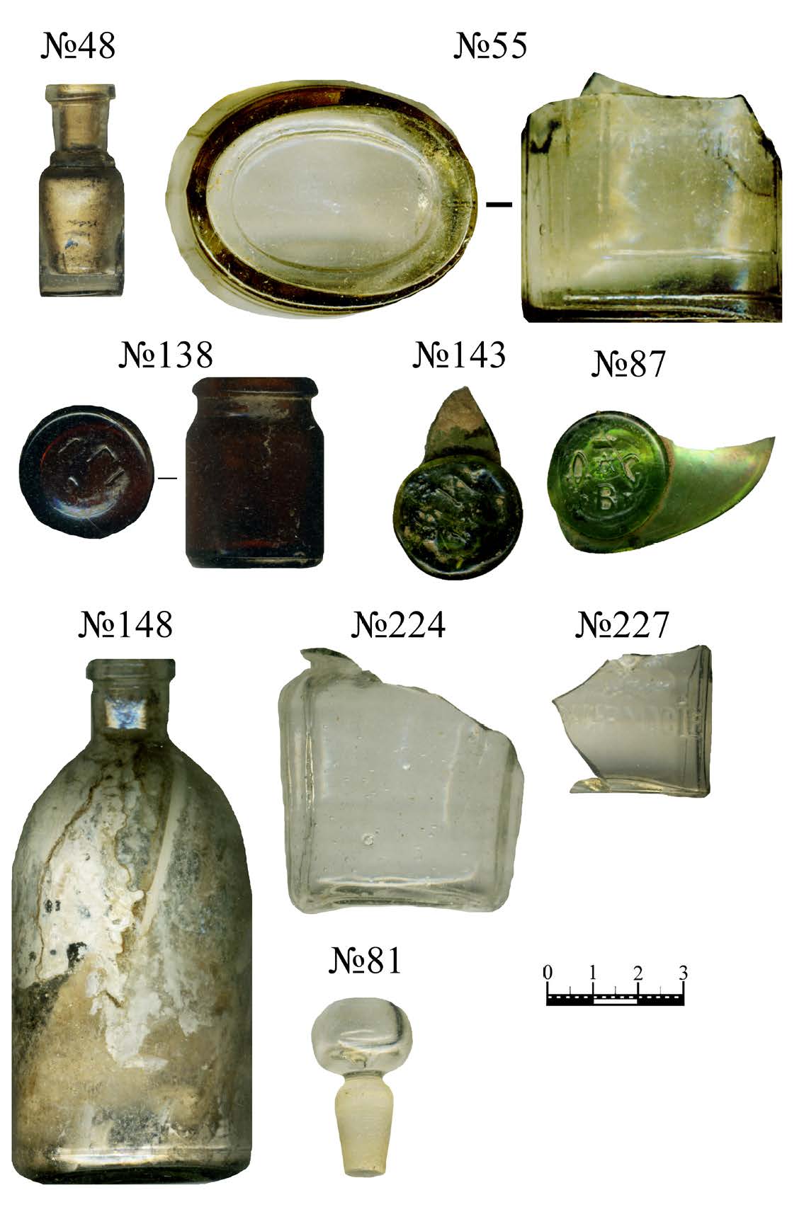 Наиболее представлен находками период второй пол. XIX в. Самые яркие датирующие находки с изолированного от остальных раскопа 2 2005 г. в основном опубликованы [Сыроватко, Чувиляева], [Сыроватко, 2013а; 2013b; 2017], большая их часть повторена на Илл. 11. Раскопом 2 не полностью открыта отдельно стоявшая жилая постройка, вероятнее всего, одной из племянниц, поздний возраст которой по находкам очевиден. Рассмотрим предметы из раскопа 1 и раскопов 2009 г., 2018–2020 гг., ранее не публиковавшиеся. Предметами с надежной датировкой являются фрагменты бутылки крымского вина (Илл. 3 — № 70, Товарищество Христофорова, 1853 г. — нач. ХХ в.), две свинцовые пломбы от чая купца М. П. Медведева (Илл. 12, №№ 71, 85), форменная железнодорожная пуговица и фрагмент пузырька (Илл. 3, № 34) от дегтярных капсул Гиршфельдта (основанием для датировки является реклама в газете «Кавказ», № 202, 1879 г.; верхний диапазон, вероятно, нач. XX в.). Конечно, отчасти датирующими являются многочисленные аптечные пузырьки, но датированных клейм на них нет (Илл. 3:18, 36, 54, 69, 76; Илл. 6, №№ 36, 40; Илл. 13, №№ 48, 55, 138, 148, 224, 227; Илл. 14:2).