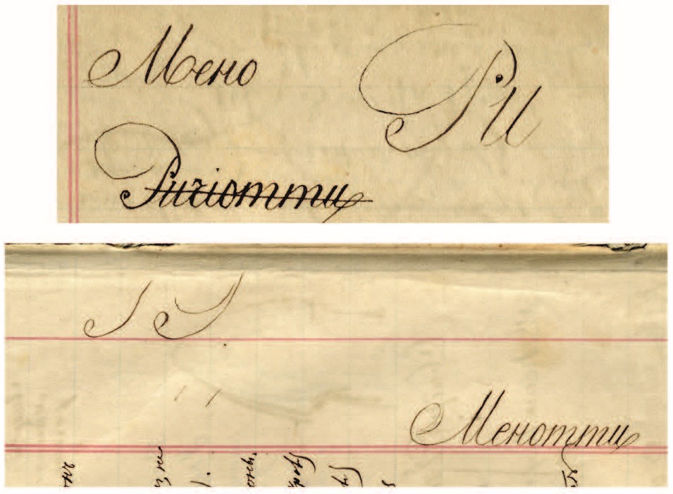 Что означают эти каллиграфические записи? Это имена двух сыновей героя Рисорджименто Джузеппе Гарибальди (Ricciotti3 и Domenico Menotti Garibaldi) — соратников отца, активных участников национально-освободительного движения в Италии, о которых часто писала европейская, в том числе и русская пресса4. В прочтении одного из этих имен К. А. Баршт делает курьезную ошибку — запись на кириллице воспроизводит как сделанную на латинице: «Puriommu» [Баршт, 2005: 90]. Получилась знаменитая чеховская «renixa» — «чепуха»5. А отдельно записанную, но не дописанную первую букву того же имени «Риччiотти» — «Р», не поместившуюся на полях из-за сгиба тетради, К. А. Баршт прочитывает как кириллическое «У», хотя в азбуке каллиграфических написаний Достоевского заглавная «У» пишется совершенно иначе. Ср.:
