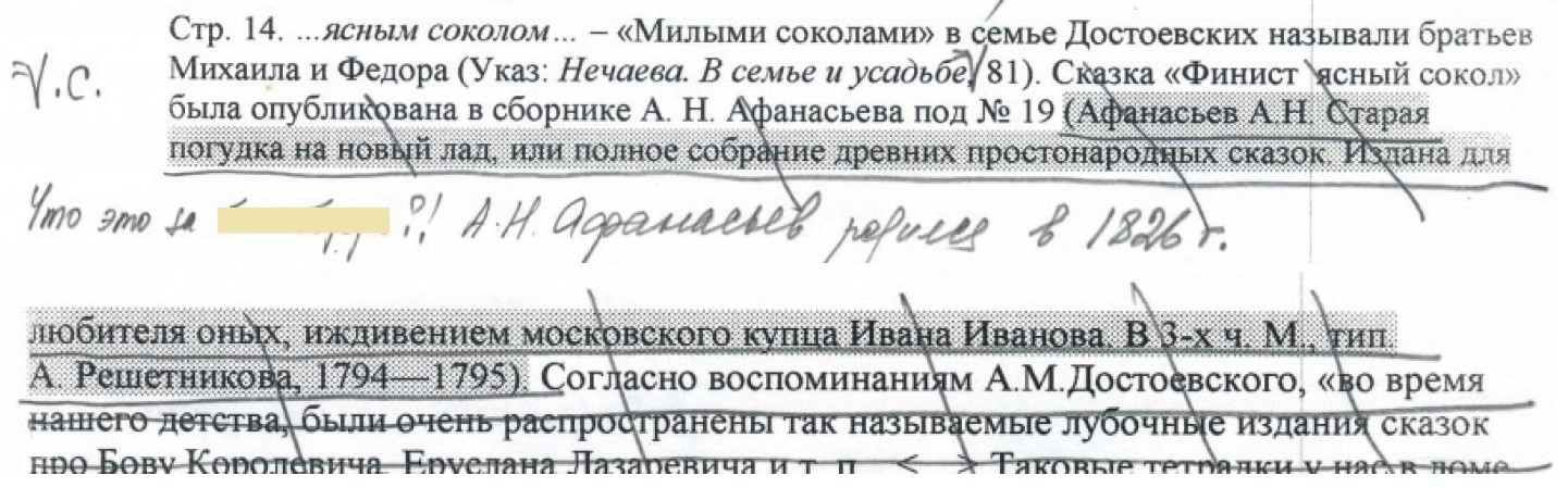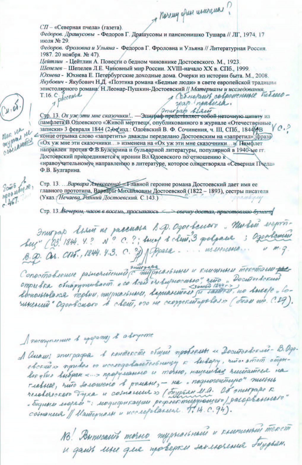 38 Слова: Отметка желтым — Ваша? — принадлежат автору обсуждаемой статьи и, по-видимому, обращены к кому-то, кто принимал участие в подготовке материала статьи (но почему-то не указан). Впрочем, если в подготовке статьи приняли участие несколько авторов, то уже из приведенных примеров следует, что ни один из них не знает ни почерка Достоевского, ни принципов академической публикации его текстов. В рукописи Достоевского, конечно же, слова «Отметка желтым — Ваша?» отсутствуют. То, что они остались в окончательном, опубликованном (в том числе в электронном виде, см.: http://lib2.pushkinskijdom.ru/Media/Default/PDF/Dostoevsky/%D0%94%D0%9C%D0%98-22.pdf) варианте статьи, лишний раз показывает, насколько небрежен К. А. Баршт в работе даже над собственными текстами. Между тем в данном сборнике, где опубликована статья, К. А. Баршт значится также ответственным редактором.