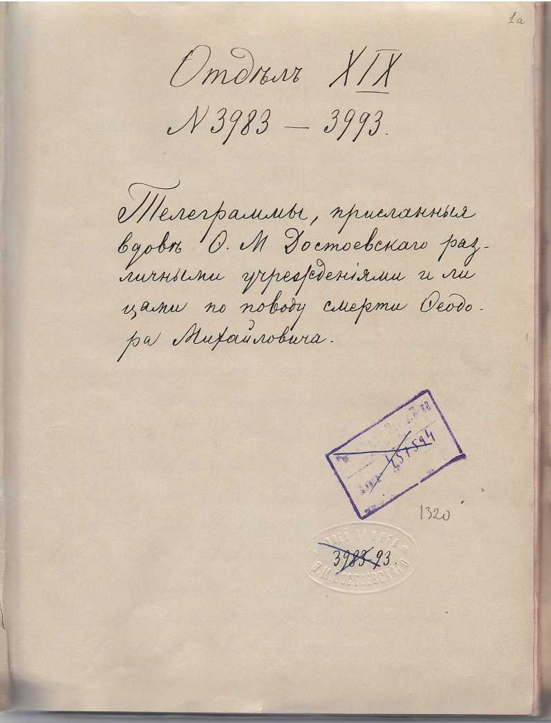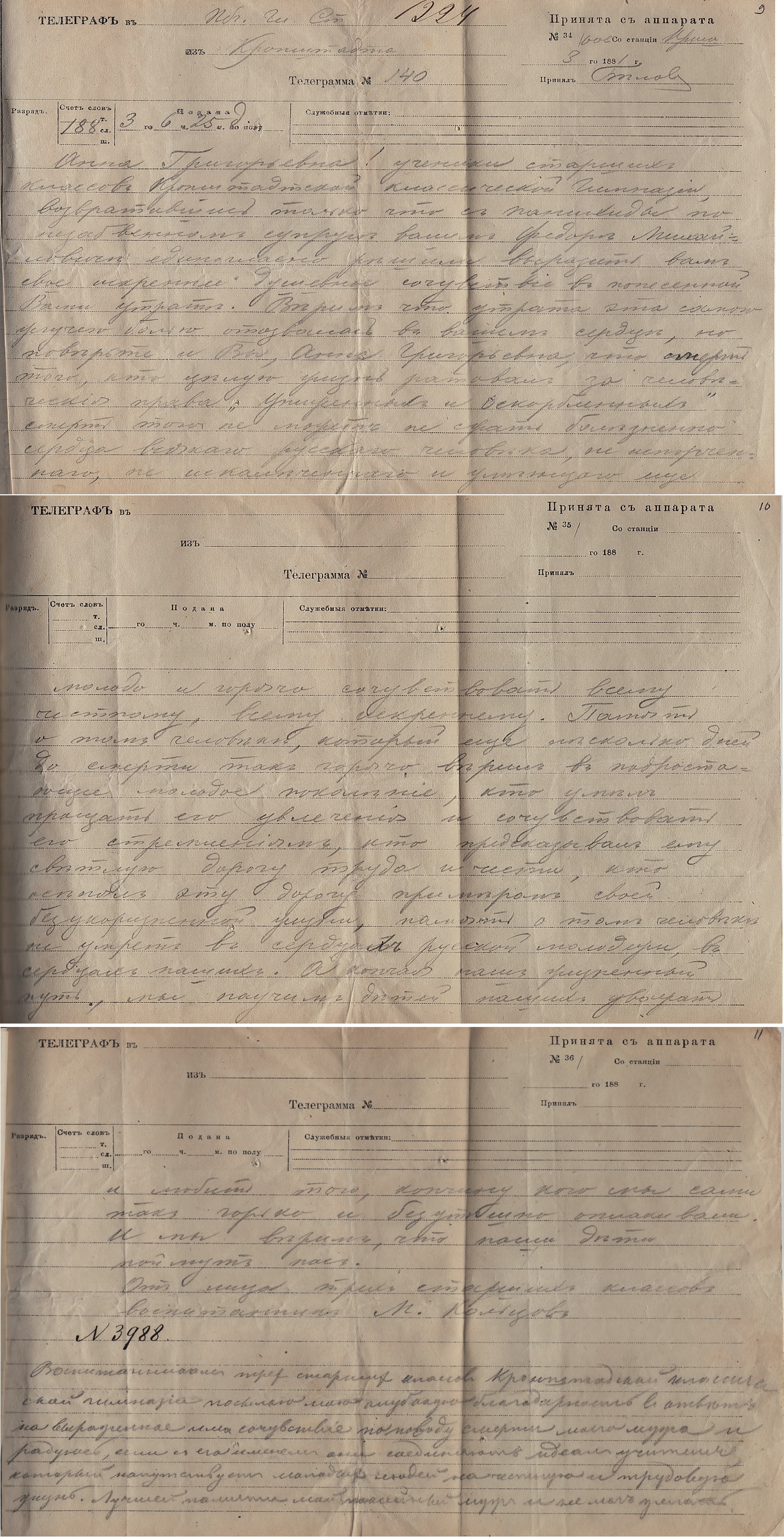 Анна Григорьевна вспоминает, что сочувственные телеграммы стали поступать еще в дни болезни Достоевского. И естественно, что поток их увеличился сразу после смерти писателя. В рукописном отделе Государственного музея истории российской литературы им. В. И. Даля в составе материалов, собранных А. Г. Достоевской для «Музея памяти Ф. М. Достоевского» хранится тетрадь, в которую вклеены бланки с телеграммами соболезнований, поступивших в адрес вдовы с 27 января по 20 февраля (старого стиля) 1881 г. (Ф. 81. Оп. 2. Д. 42). Всего 12 телеграмм. География отправления очень обширная, не только Россия — Москва, Тверь, Кронштадт, Казань, Саратов, Харьков, Одесса, Старая Русса, но и Европа — Рим, Белград. Среди отправителей лица самого разного возраста и социального положения: великие князья Сергей и Павел Александровичи, прославленный генерал М. Г. Черняев, о котором не раз писал Достоевский в «Дневнике писателя» в 1876–1877 гг., харьковский педагог Х. Д. Алчевская, состоявшая в переписке с Достоевским и бывавшая у него в гостях в Петербурге, учащаяся молодежь, преподаватели, представители литературной общественности из регионов, различные сообщества городской провинциальной интеллигенции (Одесское славянское общество, Казанское общество земледельческих колоний и ремесленных приютов, Старорусское городское общество и др.).