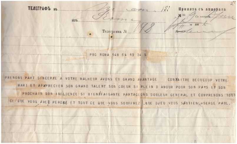 {Принимаем искреннее участие в вашем несчастье. Имели великую возможность хорошо знать Вашего мужа и оценить его великий талант, его полное любви к своей стране и его близким сердце, его столь благотворное влияние. Разделяем общую скорбь и понимаем всю вашу потерю и всё ваше страдание. Пусть Господь поддерживает вас. = Сергей. Павел.}1