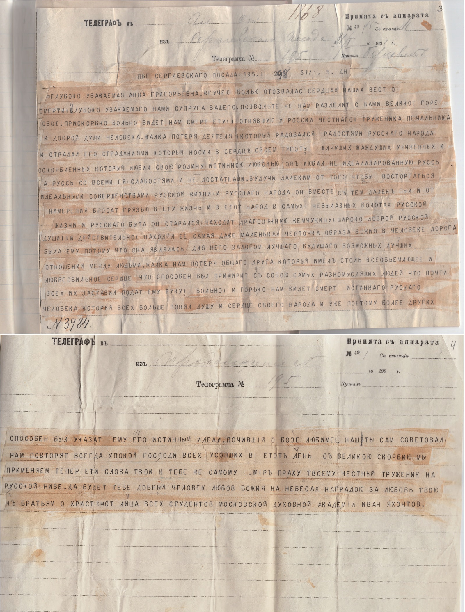 Глубоко уважаемая Анна Григорьевна. Жгучею болью отозвалас<ь> сердцах наших вест<ь> о смерти глубоко уважаемаго нами супруга вашего. Позвольте же нам разделит<ь> с вами великое горе свое. Прискорбно больно видет<ь> нам смерт<ь> ету отнявшую у России честнаго труженика печальника и доброй души человека. Жалка потеря деятеля который радовался радостями русскаго народа и страдал его страданиями который носил в сердце своем тяготы алчущих жаждущих униженных и оскорбленных который любил свою родину истинною любовью он любилъ не идеализированную Руссь а Руссь со всеми ея слабостями и не достатками. Будучи далеким от того чтобы восторгаться идеальными совершенствами русской жизни и русскаго народа он вместе съ тем далекъ был и от намерения бросат<ь> грязью в ету жизнь и в етот народ в самых невылазных болотах русской жизни и русскаго быта он старался находит<ь> драгоцѣнную жемчужину широко доброй русской души, и действительно находил ее. Самая даже маленькая черточка образа Божия в человеке дорога была ему потому что она являлась для него залогом лучшаго будущаго возможных лучших отношений между людьми. Жалка нам потеря общаго друга который имелъ столь всеобьемлющее и любвеобильное сердце что способен был примирит<ь> съ собою самых разномыслящих людей что почти всех их заставил подат<ь> ему руку. Больно и горько нам видет<ь> смерт<ь> истиннаго рускаго человека который всех больше понял душу и сердце своего народа и уже поетому более других способен был указат<ь> ему его истинный идеал. Почившiй о Бозе любимец наш ты сам советовал нам повторят<ь> всегда Упокой Господи всех усопших в етотъ день съ великою скорбию мы применяем тепер<ь> ети слова твои к тебе же самому. Мiръ праху твоему честный труженик на русской ниве. Да будет тебе добрый человек любов<ь> Божия на небесах наградою за любовь твою къ братьям о Христѣ = От лица всех студентов Московской Духовной академии Иван Яхонтов. (См. илл. 3а, б)