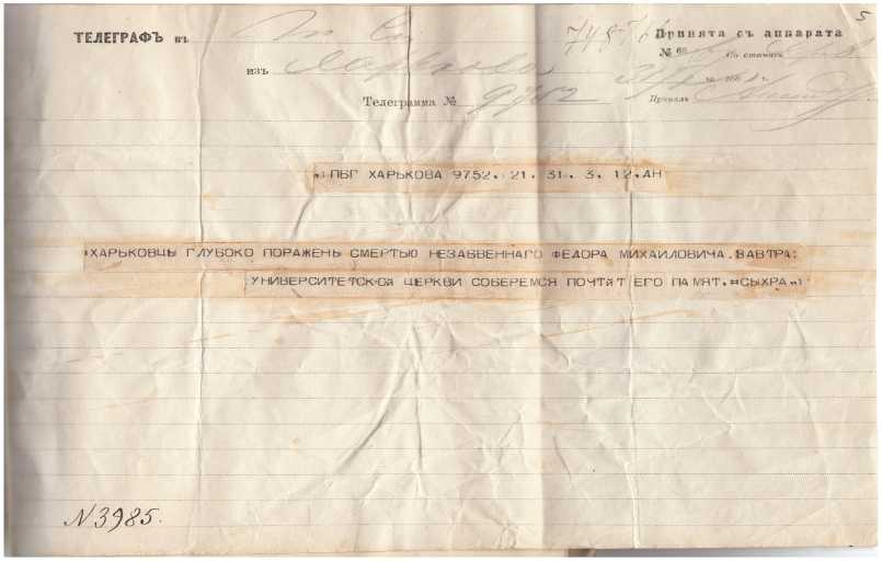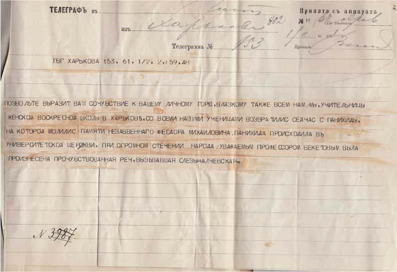Харьковчане отстаивают поминальную службу в университетской церкви, где перед собравшимися выступает многоуважаемый профессор Н. Н. Бекетов, и телеграфируют Анне Григорьевне, делясь волнением от проникновенного слова («прочувствованная речь, вызвавшая слезы») и совместной молитвы.