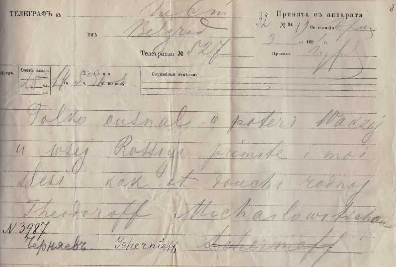Tolko ouznal o poteri Waczej u wsej Rossiyi primite i moi slesi kak ot douchi rodnoj Theodoroff Michailowitschou. Tschernieff (см. илл. 7)