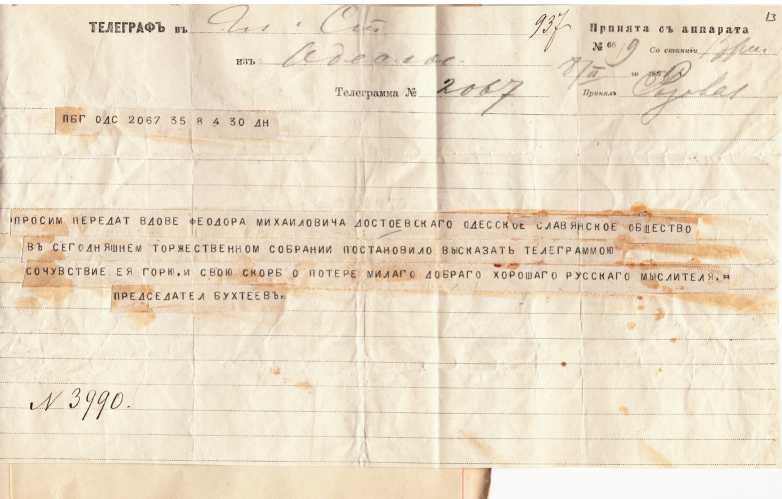 Просим передат<ь> вдове Феодора Михаиловича Достоевскаго. Одесское славянское общество въ сегодняшнем торжественном собрании постановило высказать телеграммою сочувствие ея горю, и свою скорб<ь> о потере милаго добраго хорошаго русскаго мыслителя = Председател<ь> Бухтеев (см. илл. 10)