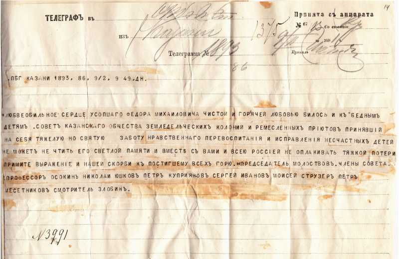 Любвеобильное сердце усопшаго Федора Михайловича чистой и горячей любовью билось и къ беднымъ детямъ. Советъ казанскаго общества земледельческихъ колоний и ремесленныхъ прiютовъ принявшiй на себя тяжелую но святую заботу нравственнаго перевоспитанiя и исправленiя несчастныхъ детей не можетъ не чтить его светлой памяти и вместѣ съ вами и всею Россiей не оплакивать тяжкой потери. Примите выраженiе и нашей скорби къ постигшему всехъ горю. = Председатель Молоствовъ. Члены совета: профессоръ Осокинъ Николай Юшковъ Петръ Куприяновъ Сергей Ивановъ Моисей Струзеръ Петръ Месетниковъ смотритель Злобинъ. (См. илл. 11)