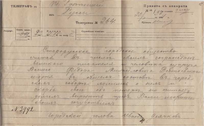 Старорусское городское общество считая въ числѣ своихъ согражданъ великаго писателя и человѣка, супруга Вашего Федора Михайловича Достоевскаго, сегодня въ общемъ составѣ въ городскомъ соборѣ молилось о немъ и скорбь свою объ потерѣ его считаетъ долгомъ выразить предъ Вами искренно своимъ сочувствiемъ. = Городской голова Иванъ Дьячковъ (см. илл. 12)