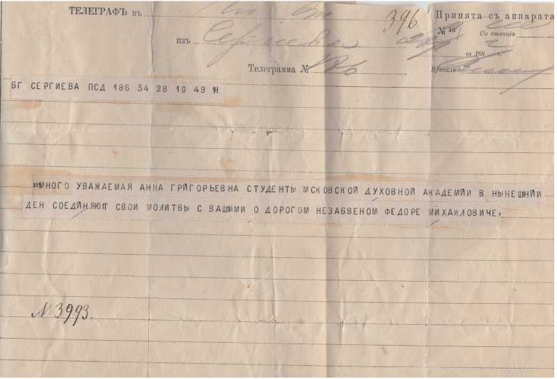 Много уважаемая Анна Григорьевна студенты Московской духовной академии в нынешний ден<ь> соединяют свои молитвы с вашими о дорогом незабвенном Федоре Михайловиче. (См. илл. 13).