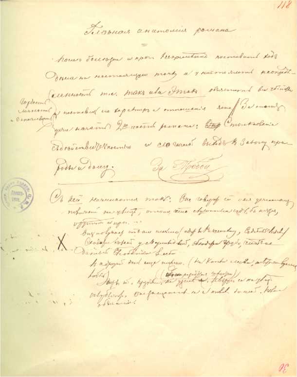 «Преступление и наказание», Мармеладова. Страница, на которой находится запись, посвящена разработке сцены гибели Мармеладова под колесами конной коляски («с виду богатой и щегольской, барской» — 7; 320). На этом этапе разработки эпизода Мармеладов именовался Аркадием Семенычем или Аркадием Степанычем и лишь затем, в окончательной версии романа, получил имя Семена Захарыча. Страница помечена как «XIII глава» — по нумерации версии, опубликованной в «Русском Вестнике»28, в окончательной редакции романа это 7-я глава второй части «Преступления и Наказания» (6; 136–151).