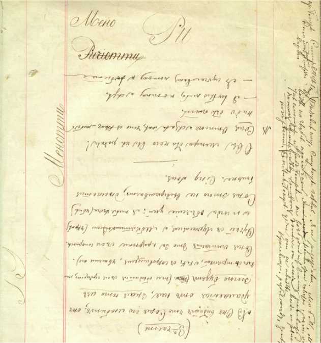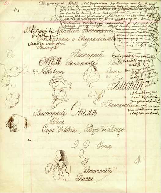 Возможны два варианта интерпретации каллиграфических записей «От», «Отто», размещенных на полях слева. Посещая Ревель, Достоевский мог слышать о скандальной истории барона Отто Рейнгольда Людвига фон УнгернШтернберга (1744–1811). Утонченный ревельский аристократ, он тем не менее активно занимался пиратством в Финском заливе, за что в конечном итоге был арестован и сослан в Сибирь. Такого рода «неистовые» характеры особенно интересовали писателя в период создания романов «Преступление и наказание» и «Идиот». Отмечая ряд каллиграфических прописей Достоевского, фиксирующих имена римских императоров «Caius Caligula, Claudius, Nero, Galba, Vittellius, Vespasianus» (РГАЛИ. Ф. 212.1.6. С. 106), Б. Н. Тихомиров обнаруживает в этом ряду запись «Оtto», трактуя ее как ошибочное написание имени императора Отона (лат. Otho). Ранее такой вариант написания имени императора Отона поставлен в связь с записью «Дaнилов, Ott» (РГАЛИ. Ф. 212.1.5. С. 10)8. Отсюда можно предположить, что эту запись также «допустимо интерпретировать как недописанное имя Ott<o> (тем более что между Нероном и Отоном существовали сложные личные отношения)» [Тихомиров: 12].