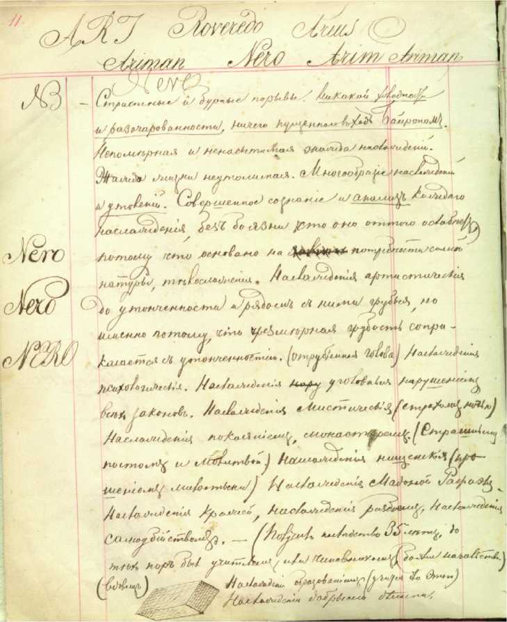 Ряд каллиграфических прописей из древней истории. «Nero» (3 р. слева и 2 р. вверху страницы) — римский император Нерон (Claudius Caesar Nero; 37–68 н. э.), черты его характера были использованы Достоевским при строительстве образа персонажа, одержимого «страстными и бурными порывами».