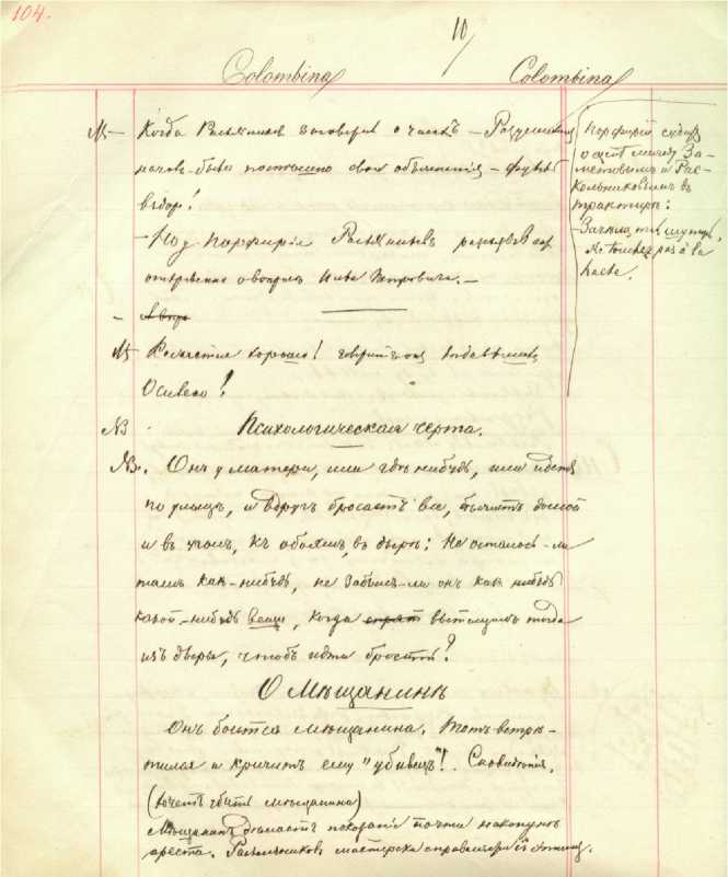 «Colombina» — персонаж итальянской и французской комедии масок, пронырливая особа, как правило, находящаяся в центре сюжетной интриги и скрепляющая собой классический любовный треугольник: Арлекин, Коломбина, Пьеро. Пропись, вероятно, связана с разработкой писателем отношений соперничества между Разумихиным и Лужиным в их борьбе за Дуню Раскольникову: «Разумихин <…> понял, что ему неприлично было вчера ругать Лужина, потому что он сам влюблен, а следственно, Лужин ему соперник» (7; 174).