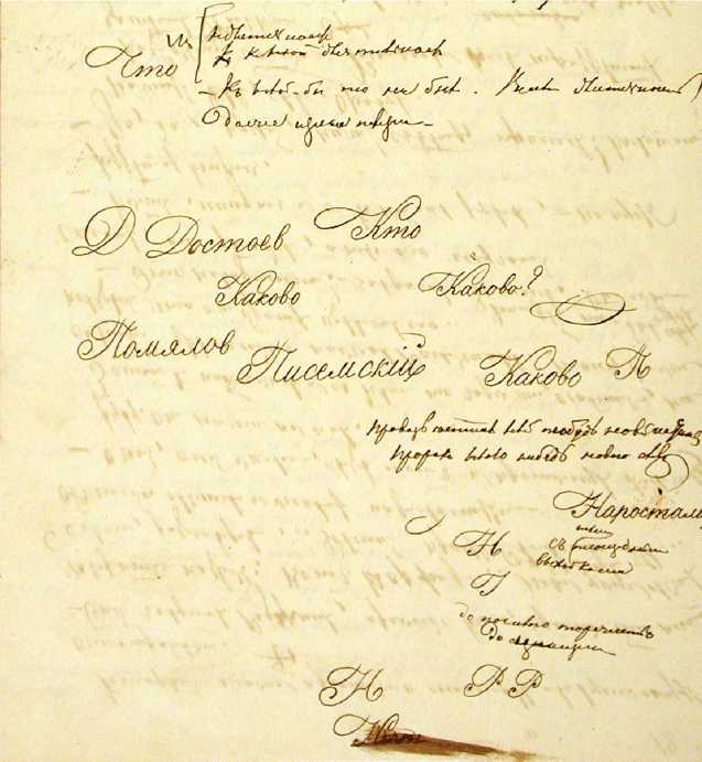 «Помялов<ский>», «Писемский», «Достоев<ский>»: в центре размышлений Достоевского о современной русской литературе, запечатленных в этих прописях, были Н. Г. Чернышевский (1828–1889), автор романа «Что делать?» (1862), А. И. Герцен (1812–1870), публицист, писатель и издатель, автор одного из самых крупных литературных явлений 1840-х гг., повести «Кто виноват?» (1846), прозаик-бытописатель А. Ф. Писемский (1821–1881), автор антинигилистического романа «Взбаламученное море» (1863), также поднимавший тему протестных настроений среди «новых людей» в русском обществе и Н. Г. Помяловский (1835–1863), самыми известными произведениями которого стали «Мещанское счастье» и «Молотов» (1861).