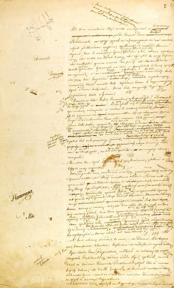 Запись «Поруч. Достоевск<ий>», оформленная в виде подписи, завершающейся росчерком, имеет автобиографический характер. В 23 года, в возрасте Родиона Раскольникова, будущий писатель имел чин инженерного подпоручика и, выйдя в отставку 19 октября 1844 г., получил чин следующего ранга, инженер-поручика, с прибавлением: «в отставке»10. Запись связана с решением вопроса о дальнейшем развитии сюжета романа, где решающую роль играет литературный дебют Раскольникова, в котором он обосновывает свой протест против унизительной социальной роли, предлагаемой ему обществом. Работая над этим эпизодом, писатель вспоминал свой литературный дебют, в котором важное значение имел отказ от государственной службы.