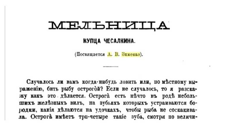После выхода в 1863 г. «Бутузки» в журнале братьев Достоевских литературная деятельность Салова прервалась на 13 лет, что было связано с изменением в начале 1860-х его семейного, материального и служебного положений. Женившись в ноябре 1861 г., он на два года уехал за границу, а затем уже навсегда поселился в Саратовской губернии. Здесь выходец из семьи разорившихся дворян получил неожиданное наследство — имение Ивановка, был избран мировым судьей, «каковым и прослужил со дня открытия мировых судебных учреждения в Саратовской губернии до дня закрытия таковых»21. Но именно Зименко, у которого с Саловым установились дружеские взаимоотношения, стал инициатором возвращения последнего в 1870-е гг. в литературу (к тому времени Салов уже остался вдовцом «с двумя детьми на руках»). «Очень может быть, — вспоминал Салов, — что, занявшись службой и хозяйством, я и совсем бы забыл про литературу, если бы както летом не приехал ко мне Зименко, секретарь редакции “Русского Вестника”. Он прогостил у меня недели две и положительно не давал мне покоя, настаивая, чтобы я непременно что-нибудь написал и посвятил ему. Вот тогда-то я и написал рассказ “Мельница купца Чесалкина”. Рассказ этот не вымысел, и все действующие в нем лица были взяты с натуры»22. В «Мельнице купца Чесалкина» представлен выразительный образ сельского кулака-стяжателя, богомольность которого не мешала ему всячески обманывать простых мужиков. Рассказ был опубликован у Салтыкова-Щедрина в «Отечественных Записках» (1877. Т. 234. № 9) и подписан «Н. Салов» (так автор указан и в оглавлении) — псевдоним ли это писателя или ошибка наборщика, прочитавшего вместо письменной буквы «И» — «Н», достоверно неизвестно23. Автор выполнил обещание, данное Зименко, и посвятил свое первое после многолетнего перерыва произведение ему.