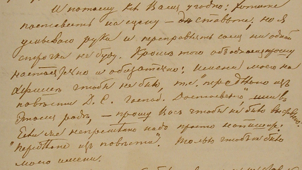 И потому какъ Вамъ угодно: хотите поставить на сцену — ставьте; но я умываю руки и переправлять самъ ни одной строчки не буду. Кромѣ того объ одномъ прошу настоятельно и обязательно: имени моего на афишѣ чтобы не было, т. е. “передѣлано изъ повѣсти Д. С. господ<ина> Достоевскаго”, или въ этомъ родѣ, — прошу Васъ чтобы не было выставлено. Если же непремѣнно надо просто напишите: “Передѣлано изъ повѣсти”. Только чтобъ не было моего имени.