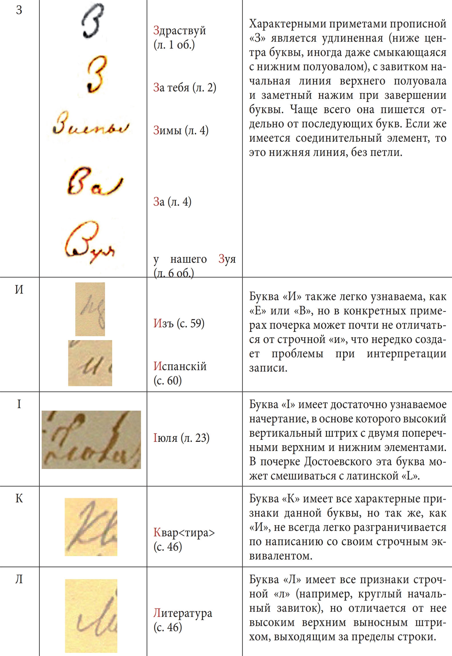 В приведенных же выше (со с. 109 ЗК) трех вариантах написания буквы «и» характерно то, что все примеры находятся в непосредственной близости друг от друга, на одной странице, в соседних предложениях. Поэтому объяснить разницу в начертаниях буквы «и» (более частотный вариант, с длинным высоким росчерком, и реже встречающийся, с полуовалом) невозможно ни разными типами документа, ни особенностями скорописи (все слова были написаны одномоментно), ни особыми условиями письма (непривычной позой, некачественной бумагой, разными видами инструментов для письма, плохим освещением, физическим недомоганием, расстройством и пр.). Все перечисленные выше условия были идентичны во всех трех примерах, тем не менее возникли разные варианты начертания буквы. Это обусловлено только самой особенностью выработанного почерка: существованием в нем большого количества вариантов написаний одного и того же знака. Данный пример, как и все другие, приведенные выше примеры, достаточно ясно указывает на проблемы расшифровки почерка Достоевского. Основные причины возникновения ошибок прочтения рукописного текста — это неразграничение начертаний, неверное их зрительное восприятие, чтение слов по «общему рисунку», неточное распознавание типичных графических признаков конкретных букв, недостаточная опора на семантику фразы. Таким образом, небесполезной оказывается работа по систематизации начертаний и составлению своего рода «графической азбуки» — описания букв в почерке Достоевского в алфавитном порядке.