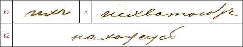 Очевидно сходство всех трех представленных образцов по следующим частным признакам: в букве «Н» в одном из вариантов пишется широкое начальное закругление; горизонтальная уходящая вверх линия может пересекать левый вертикальный элемент, а может, как в подписи «сына», писаться отдельно (ср. такое же написание в начатом неправильно обращении: [Ни]/Сергѣй/); во всех трех письмах отрыв пера при написании имени происходил в одном месте — между буквами «о» и «л».