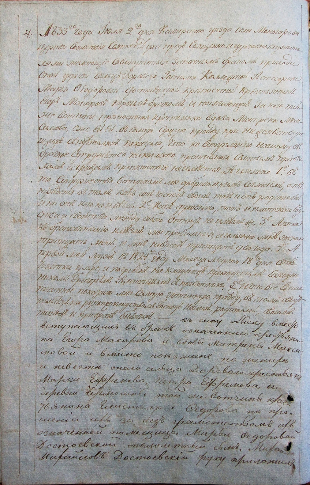 «1832го года iюля 24 дня. Каширскаго уѣзда, села Манагарова, церкви Сошествiа Святаго духа, предъ священно и церковнослужителами, желающiе совокупиться законнымъ бракомъ, приходу Оной церкви, сельца Доровои Господина, Каллежскаго ассессора, Михаила Андреевича Достаевскаго, крепостнои крестьянинъ, Ильа Васильевъ, первымъ бракомъ, и посягающая за него, тогожъ сельца и господина, крепостная крестьанская дѣвка, Елена Ѳеодулова. Еже ей ей въ самую сущую правду при ниже явствующихъ свидѣтеляхъ, показали, что ко вступленiю нашему, въ брачное супружество, никаковаго противнаго святымъ правиламъ, и Указамъ препятьствiя не имѣется. А имянно 1е, въ то супружество, въступаемъ мы, добровольнымъ согласиемъ, а принужденia въ томъ, какъ отъ господъ своихъ, такъ и отъ родителей своихъ, и ни отъ кого не имѣемъ, 2е, Какъ духовнаго, такъ и плотскаго родства и свойства, между собою отънюдь не имѣемъ же, 3е, Лѣта къ бракосочетанiю имѣемъ мы правильныя, а <и>мянно мнѣ жениху асьмнатцать лѣтъ, и мнѣ невѣсте семьнатцать лѣтъ, 4е, и что все вышеписанное, показали мы самую истинную правду. Въ томъ свидѣтельствуемся, рукоприкладствомъ Господъ нашихъ, родителей своимъ, такожъ и при бракѣ бывшихъ».