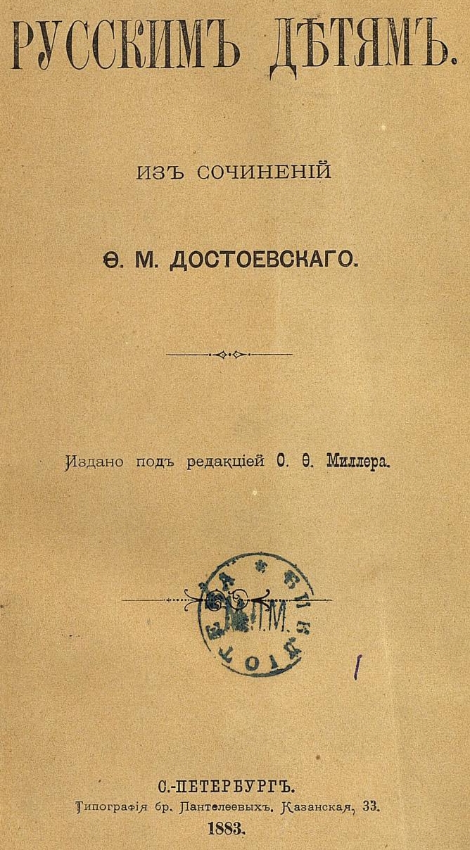 - Miller O. F. The Preface. In: Russkim detyam: iz sochineniy F. M. Dostoevskogo [For Russian Children: from the Works of F. M. Dostoevsky]. St. Petersburg, tipografiya brat’ev Panteleevykh Publ., 1883. 280 p. (In Russ.)