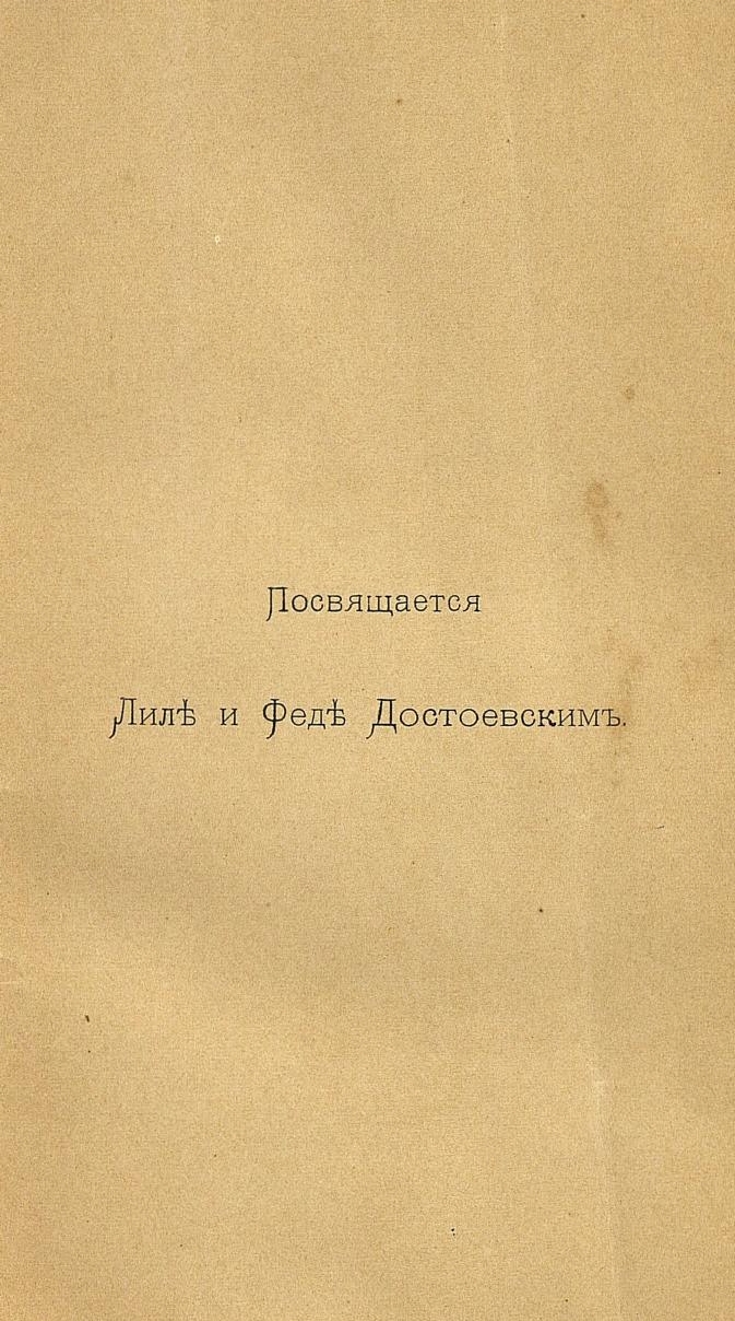 Сборник «Русским детям: из сочинений Ф. М. Достоевского» был напечатан тиражом в три тысячи экземпляров, в изящно-издательском формате (см. Илл. 1). Переплет был украшен золотым овалом с портретом писателя в обрамлении переплетенных лавровых ветвей. Название сборника не оставляло сомнений относительно адресатов книги: в подтверждение той репутации «писателя-патриота», которую Достоевский заслужил в последние годы своей жизни, адресатами сборника были русские дети. Коннотативную функцию названия сборника усиливало посвящение «Лиле и Феде Достоевским», ставшим своего рода гарантами той «отеческой» ауры, которую составители хотели придать автору (см. Илл. 2). Уточнить, кто был аудиторией сборника, можно также исходя из его стоимости. Она составляла 2 р. 50 к. (в переплете — 3 р. 25 к.), что позволяет предположить, что эти «русские дети» принадлежали к семьям высшего и среднего сословий, способным позволить себе подобную покупку6.