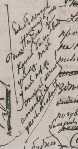 «— Да-съ, tant d’esprit[5], но сегодня поглупилъ, и еслибъ я самъ зналъ впередъ что онъ такъ напакоститъ, то принадлежа къ несомнѣнному заговору противъ васъ и вашего праздника, я бы ужъ безъ сомнѣнiя васъ не сталъ вчера отговаривать чтобъ не пускать его въ огородъ6» (РГБ. Ф. 93. I. 1. 3/6. Л. 1 об.).