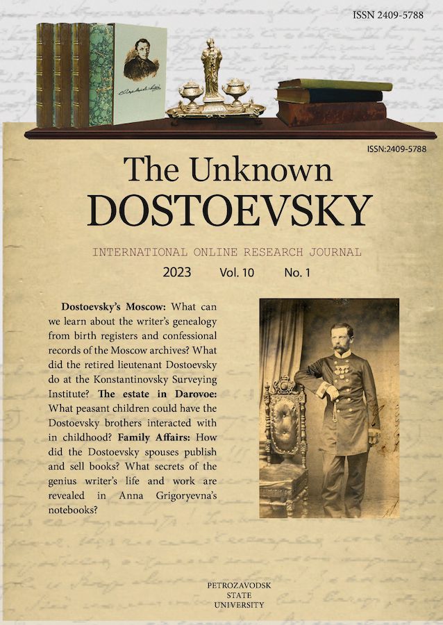 The article introduces into scientific circulation new archival and printed sources related to the Moscow branch of the family tree of F. M. Dostoevsky. They pertain to five generations of the writer’s ancestors and relatives — from the great-great-great-grandfather of the priest Andrey Grigoriev to the mother of Maria Fedorovna Nechaeva-Dostoevskaya. The certificates of M. F. Nechaeva’s birth, her brother Mikhail’s (Dostoevsky’s uncle) birth and death, the wedding of the grandfather and grandmother of the writer Fyodor Timofeevich Nechaev and Varvara Mikhailovna Kotelnitskaya, the birth and wedding of Alexandra Fedorovna Nechaeva-Kumanina (Dostoevsky’s aunt), the death of grandfather F. T. Nechaev, etc. are published. For the first time, the names of the brother of Dostoevsky’s great-great-great-grandfather, the archpriest of the Assumption Cathedral in the Kremlin, John Grigoriev, the great-grandmother of the writer Nastasia Kotelnitskaya and some other relatives are established. Clarifications and corrections have been made to the information previously published in genealogical works about members of the Dostoevsky family. The authors of the article paid special attention to the establishment of the Moscow addresses of the ancestors and relatives of the writer, laying the foundation for the creation of the “Dostoevsky’s Moscow” map in the future.