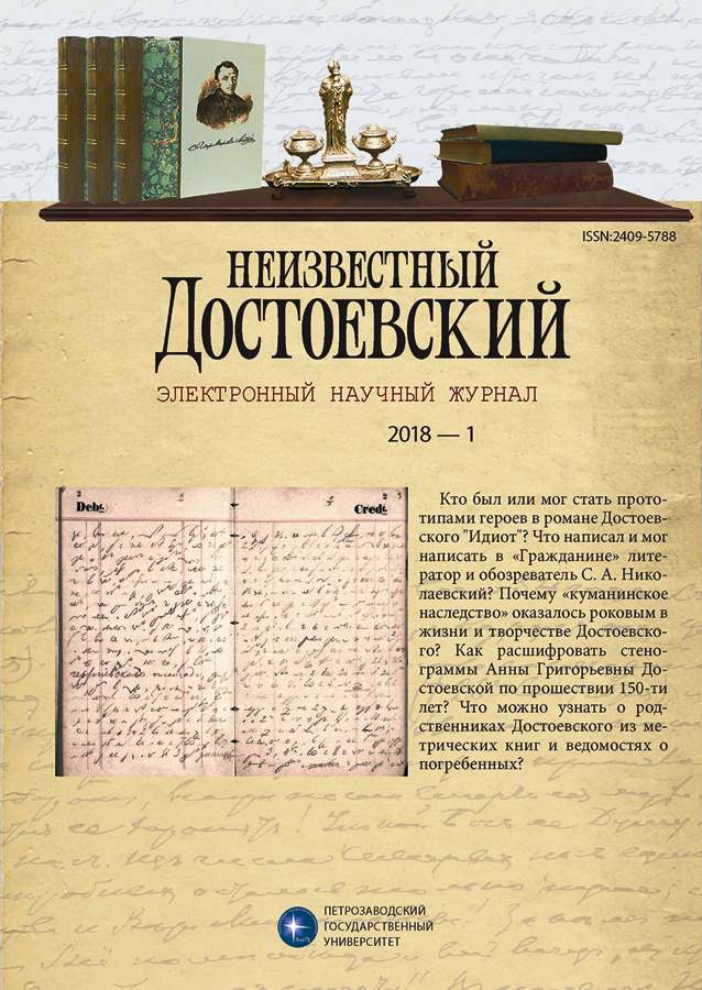 В статье рассматриваются некоторые архивные источники, касающиеся «петербургского» родословия Достоевских. Опубликованы по оригиналам и проанализированы 33 записи из метрических книг и ведомостей о погребенных, хранящихся в Центральном государственном историческом архиве Санкт-Петербурга. Все записи воспроизводятся с указанием мест архивного хранения. Знакомство с ними позволяет рассматривать данный архив как ценный источник документальных сведений по генеалогии Достоевского и его семейного окружения. Впервые вводятся в научный оборот документальные свидетельства о погребении на Смоленском, Большеохтинском Георгиевском православных кладбищах Петербурга и на кладбище Воскресенского Новодевичьего монастыря (ЦГИА СПб. Фонды 457, 641 и 639). Здесь были похоронены два младших брата и сестра Ф. М. Достоевского, представители их семей (Достоевские, Рыкачевы, Голеновские, Шевяковы, Ставровские), потомки старшего брата (Достоевские, Владиславлевы), а также родственники писателя со стороны Анны Григорьевны Достоевской (Сниткины). На основании этих документов уточнены, исправлены либо дополнены некоторые биографические данные, приведенные предыдущими исследователями.