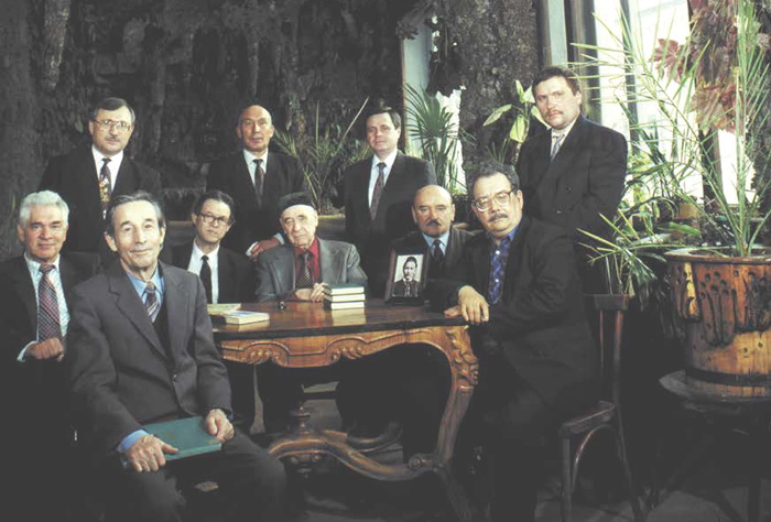 Члены Татарского ПЕН-центра «первого созыва» (1995) в «Гроте» Национальной библиотеки РТ. Слева направо – стоят: Разиль Валеев, Равиль Файзуллин, Ахат Мушинский, Ркаил Зайдулла; сидят: Рафаэль Мустафин, Нурихан Фаттах, Ильдар Юзеев, Амирхан Еники, Миркасым Усманов, Туфан Миннуллин. Фото Рустама Мухаметзянова (сайт Национальной библиотеки РТ: https://kitaphane.tatarstan.ru/library_today/writers.htm#:~:text=Региональная%20общественная%20организация%20писателей%20Республики,%3A%20поэзия%2C%20эссе%2C%20новелла)