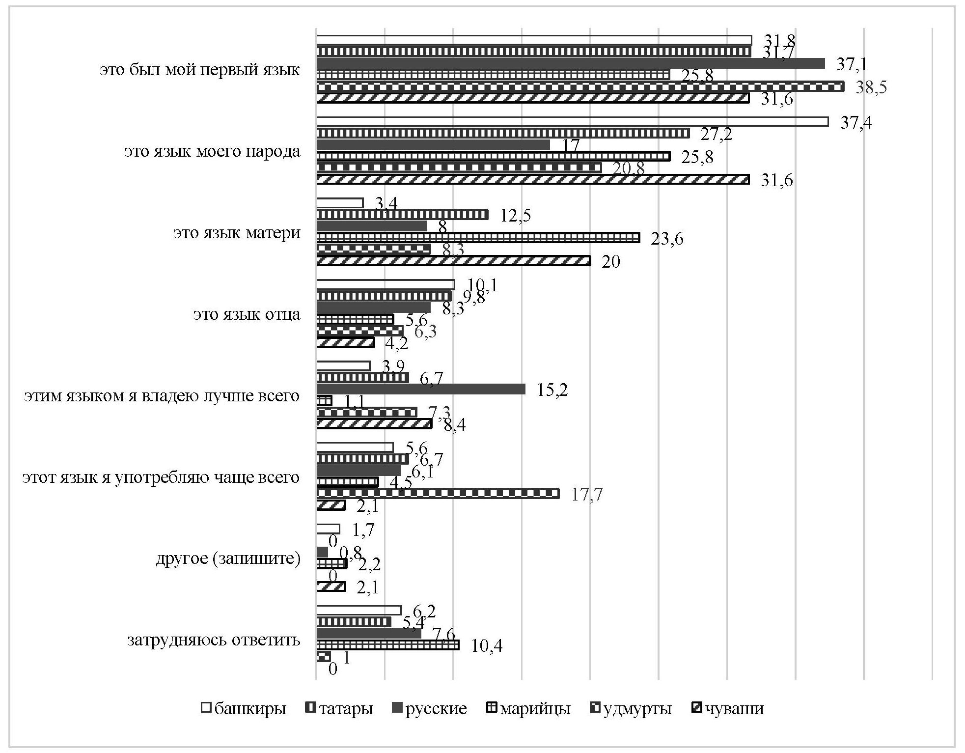 Среди марийцев и удмуртов также высокой представляется этноязыковая солидарность [17; 18]. Так, 92,8 % марийцев и 94,1 % удмуртов признались, что они ощущают близость с людьми, говорящими на языке их национальности. Такое ощущение близости у представителей других этнических групп было существенно меньше. Например, у русских оно составляло 78,7 %, у чувашей – 80,0 %, у татар – 83,9 % и у башкир – 84,3 %.
