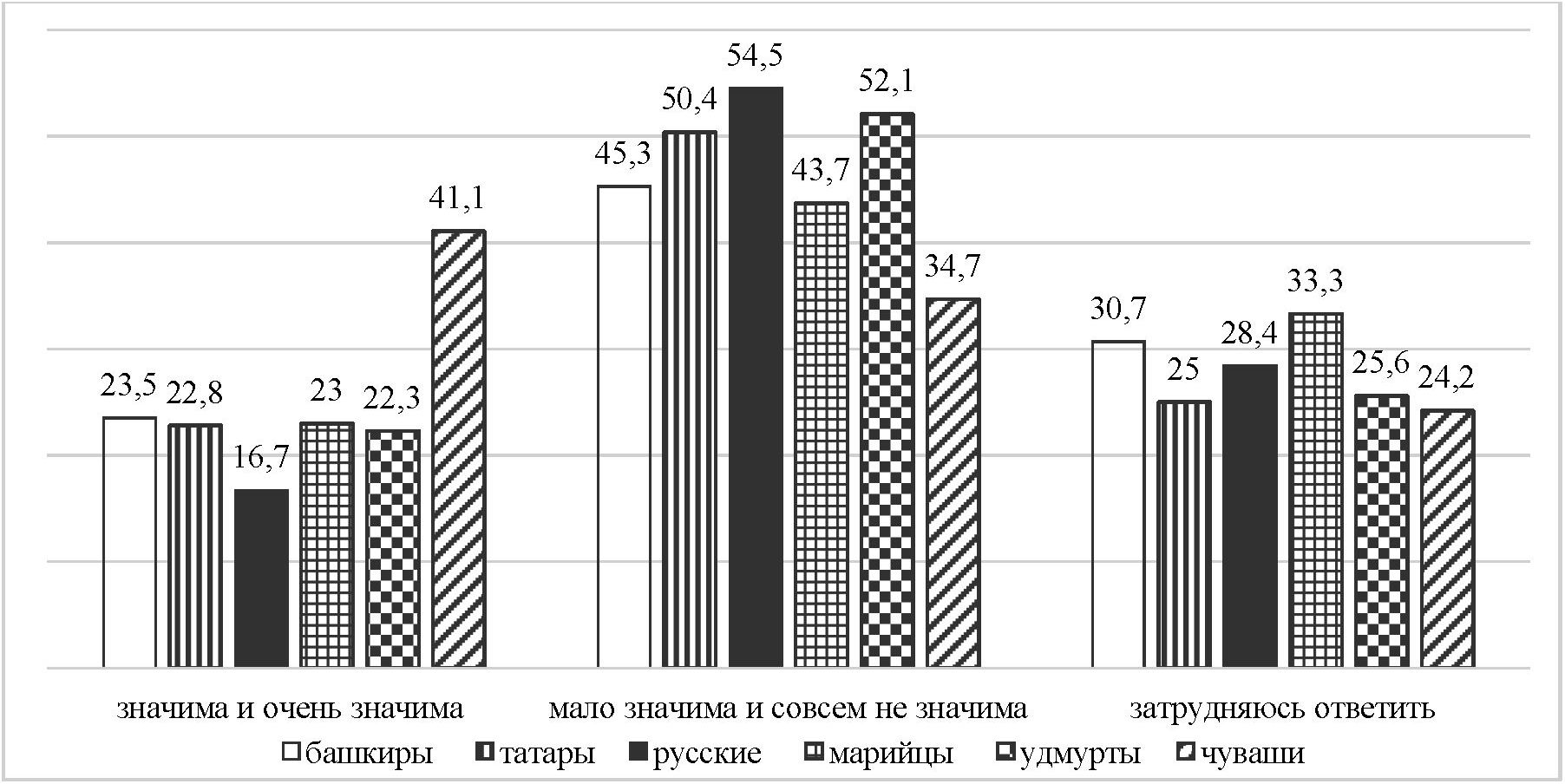 Вместе с тем данные опроса выявили, что за последние годы акцентирование этничности, по сравнению с 1990-ми гг., существенно сократилось, что, видимо, связано с разрешением ряда этнокультурных проблем [13]. Так, лишь немногим менее четверти марийцев, удмуртов, башкир и татар, каждый седьмой русский и двое из пяти чувашей отметили значимость и особую значимость своей этнической принадлежности (рис. 2). Почти более половины респондентов не стали акцентировать свою этническую принадлежность, но вместе с тем от четверти до трети респондентов с некоторыми вариациями остались в затруднительном положении, что дает пищу для размышлений, что потенциал этнической мобилизации еще не «потух» и в ряде «благоприятных» условияй может и принять новый вектор проявления [14].