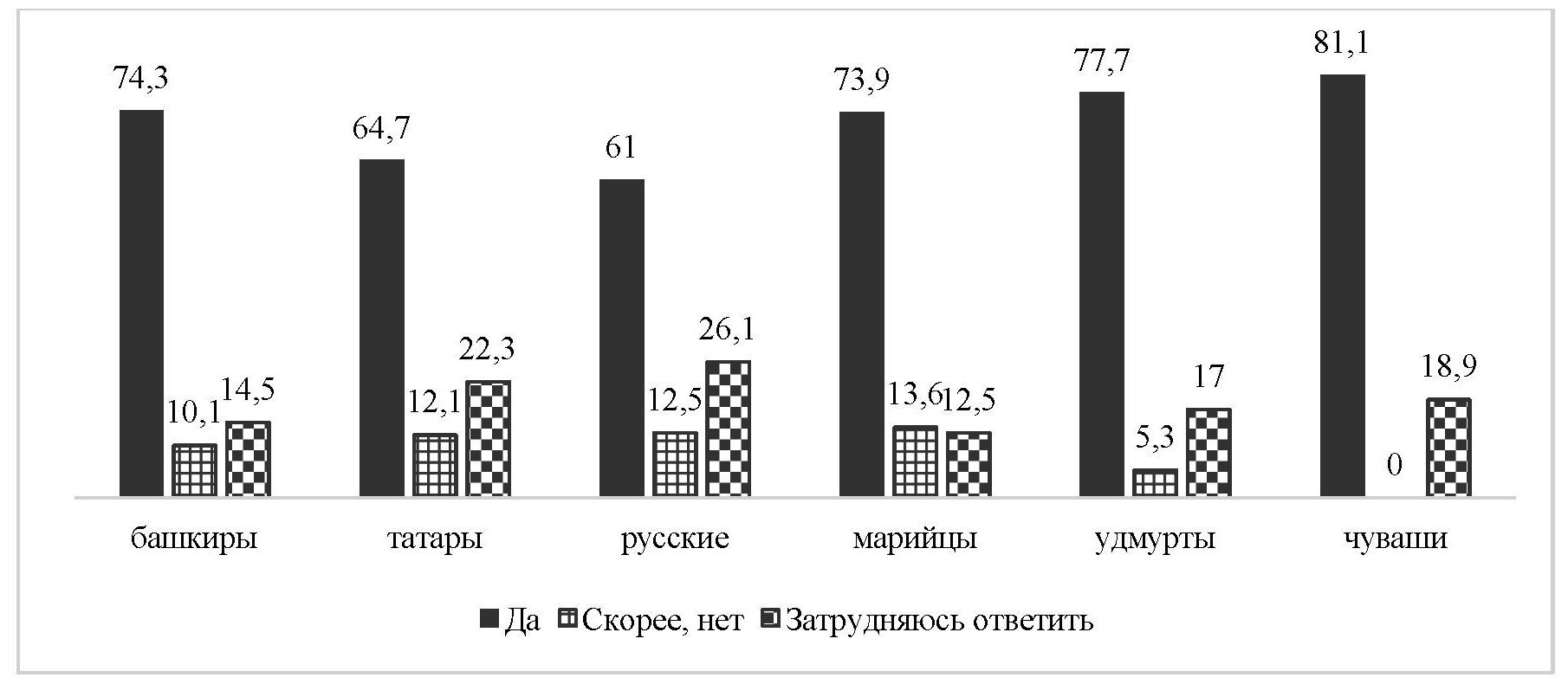Наряду с чувством близости с людьми своей национальности, в ходе опроса выяснилось, что весьма высокая доля марийцев (73,9 %) ощущает более родственные отношения с представителями своей этнической группы. С ними согласилось абсолютное большинство чувашей (81,1 %), удмуртов (77,7 %), башкир (74,3 %), а также две трети татар и русских (рис. 3).