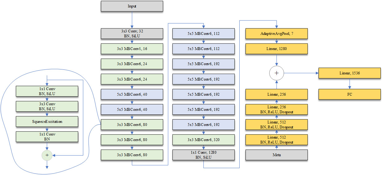 2.1. Архитектура SkinNet-v1. Как было отмечено ранее, в качестве базовой модели была использована модель, состоящая из сверточной нейронной сети и полносвязной сети для анализа кожных поражений с учетом метаданных. Последняя представлена на рисунке 2.