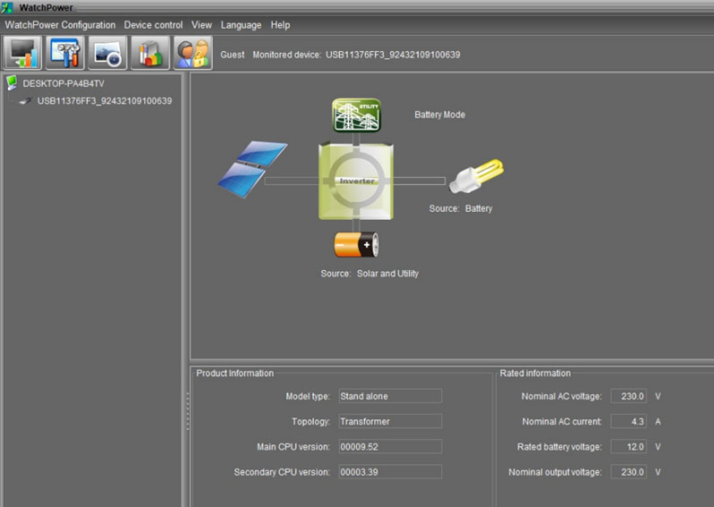 Управление и координация источников энергии осуществляется при помощи ПО Watchpower [14] (рисунок 2). Программа позволяет осуществлять управление микросетью и фиксировать показания измерительных приборов (мощность нагрузки, входное/выходное сетевое напряжение и частота, напряжение блока батарей, напряжение солнечных панелей и их коэффициент мощности). Также в программу передаются сообщения о неисправностях.