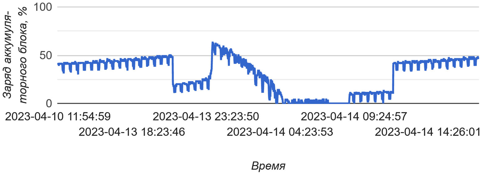 3.3. Анализ работы микросети. Внедрение системы мониторинга облегчило проведение анализа работы микросети. Минимальное напряжение на блоке аккумуляторов составило 11,72 В, максимальное – 14 В. В ходе эксплуатации фиксировался заряд аккумуляторного блока. На рисунке 4 представлена ситуация, при которой в ночное время зарегистрировано снижение уровня заряда ниже допустимого и была использована внешняя сеть для зарядки аккумуляторов. На следующий день заряд восполнялся в рабочее время с помощью газогенератора.