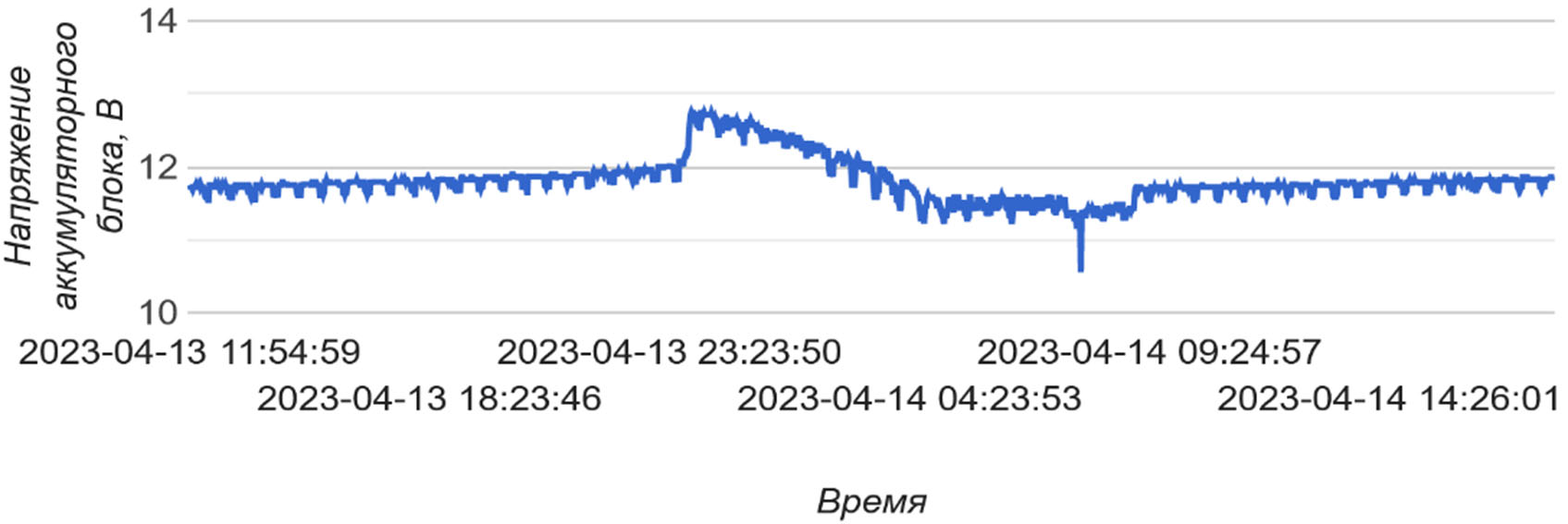 Вертикальная ось отражает напряжение аккумуляторного блока, горизонтальная ось – дату и время