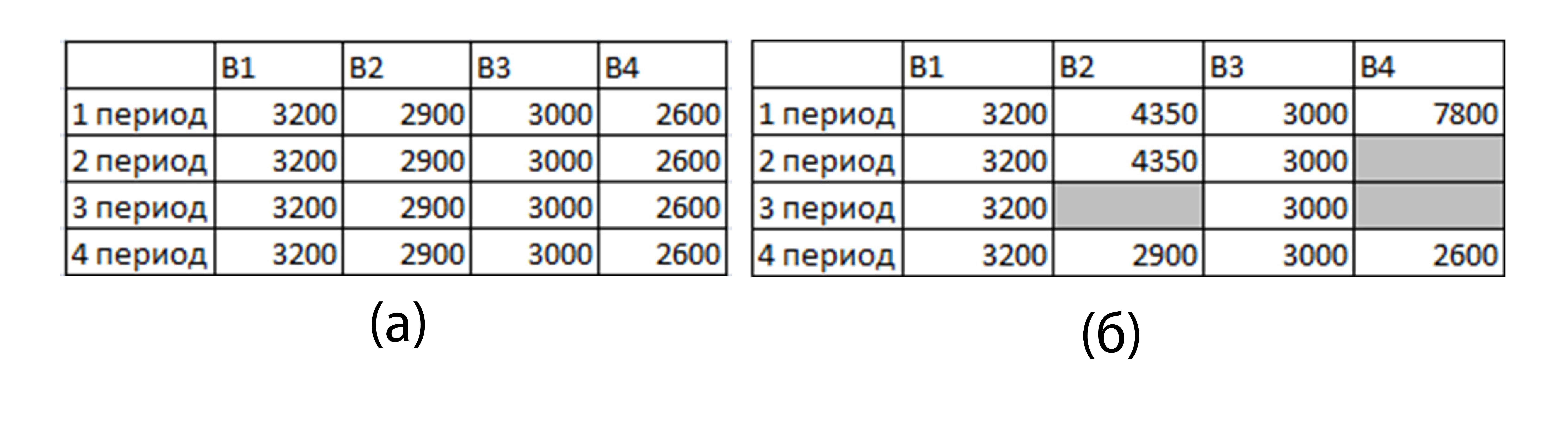 Далее перераспределяем товар по складам, рисунок 3. На этом шаге также сначала распределяем его равномерно по периодам, рисунок 3(а). Затем перебрасываем в ячейки первого и второго периодов весь товар из клеток третьего периода в размере . Аналогично перебрасываем товар из ячеек третьего и четвертого периодов в ячейки первого периода в размере . В результате получили план хранения товаров у поставщиков на складах и подачи заявок на товар в каждом периоде.