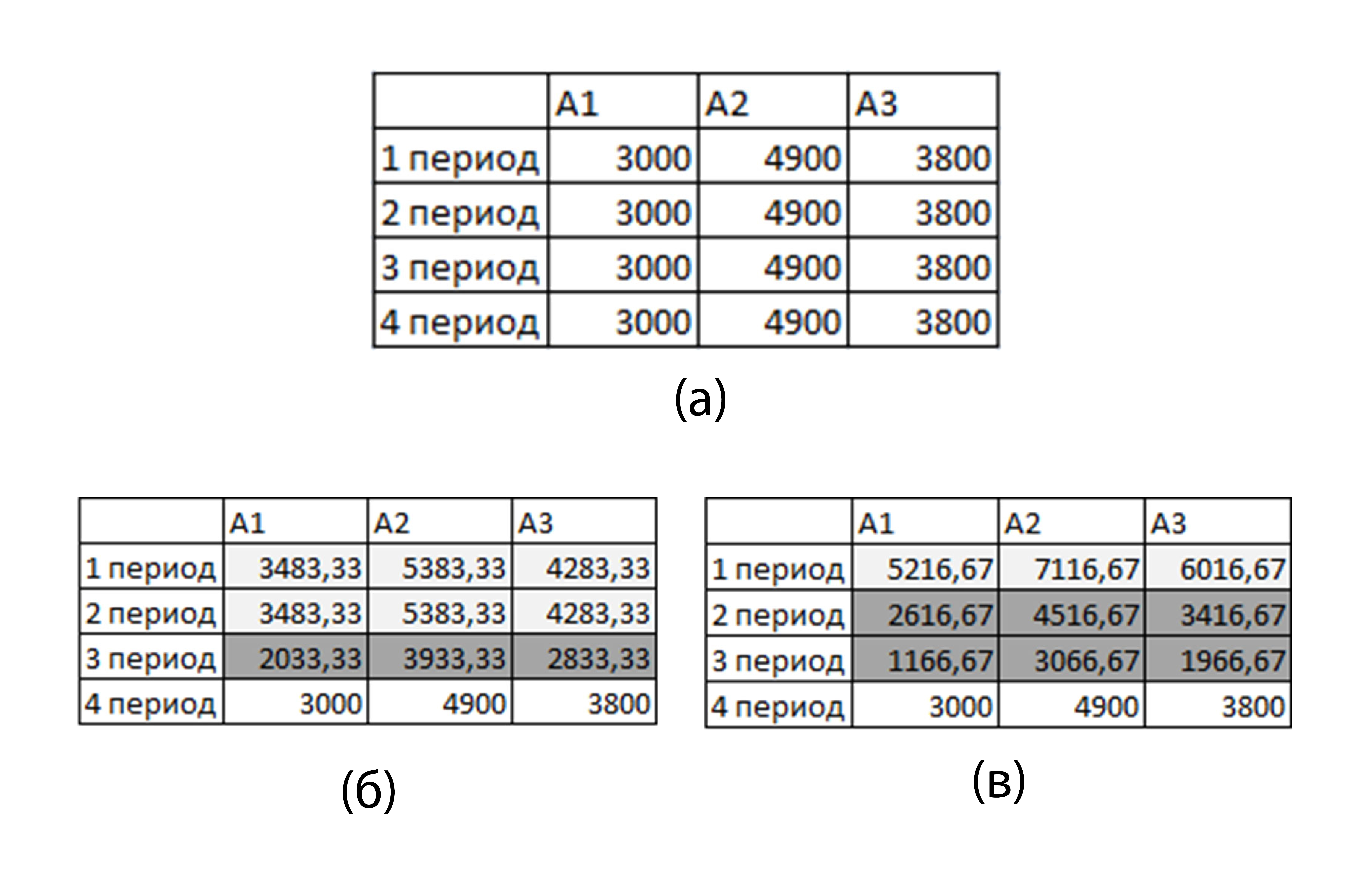 Согласно алгоритму сначала распределяем запросы равномерно по всем периодам, рисунок 2(а). Затем перебрасываем товар из ячейки (3,2) во все ячейки столбца , соответствующим периодам, предшествующим третьему, в размере . Аналогично поступаем с : перебрасываем товар со второго и третьего периодов в первый в размере . Ячейки, расположенные после недоступных периодов, не изменяем.
