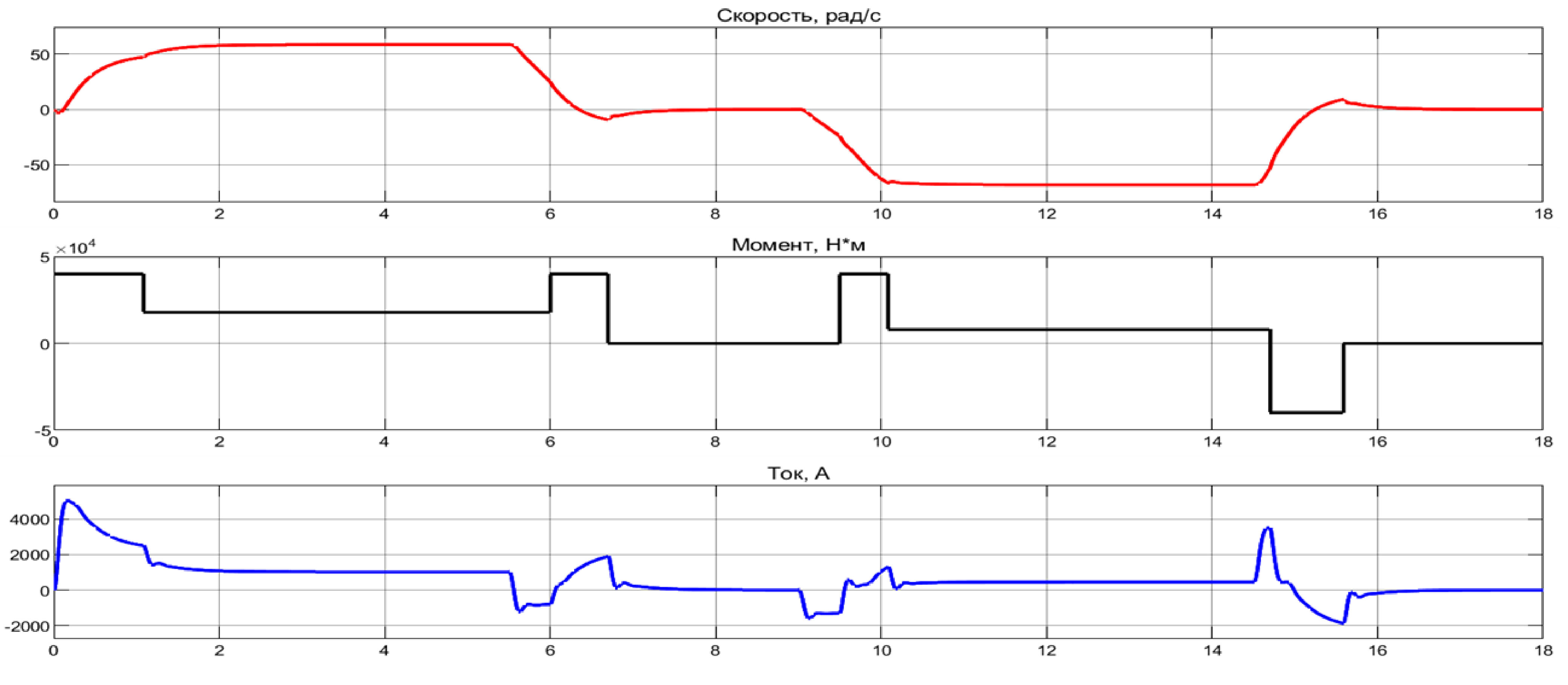 Рис. 3. Переходные процессы в модели электропривода механизма подъема ковша шагающего экскаватора с непосредственным преобразователем частоты