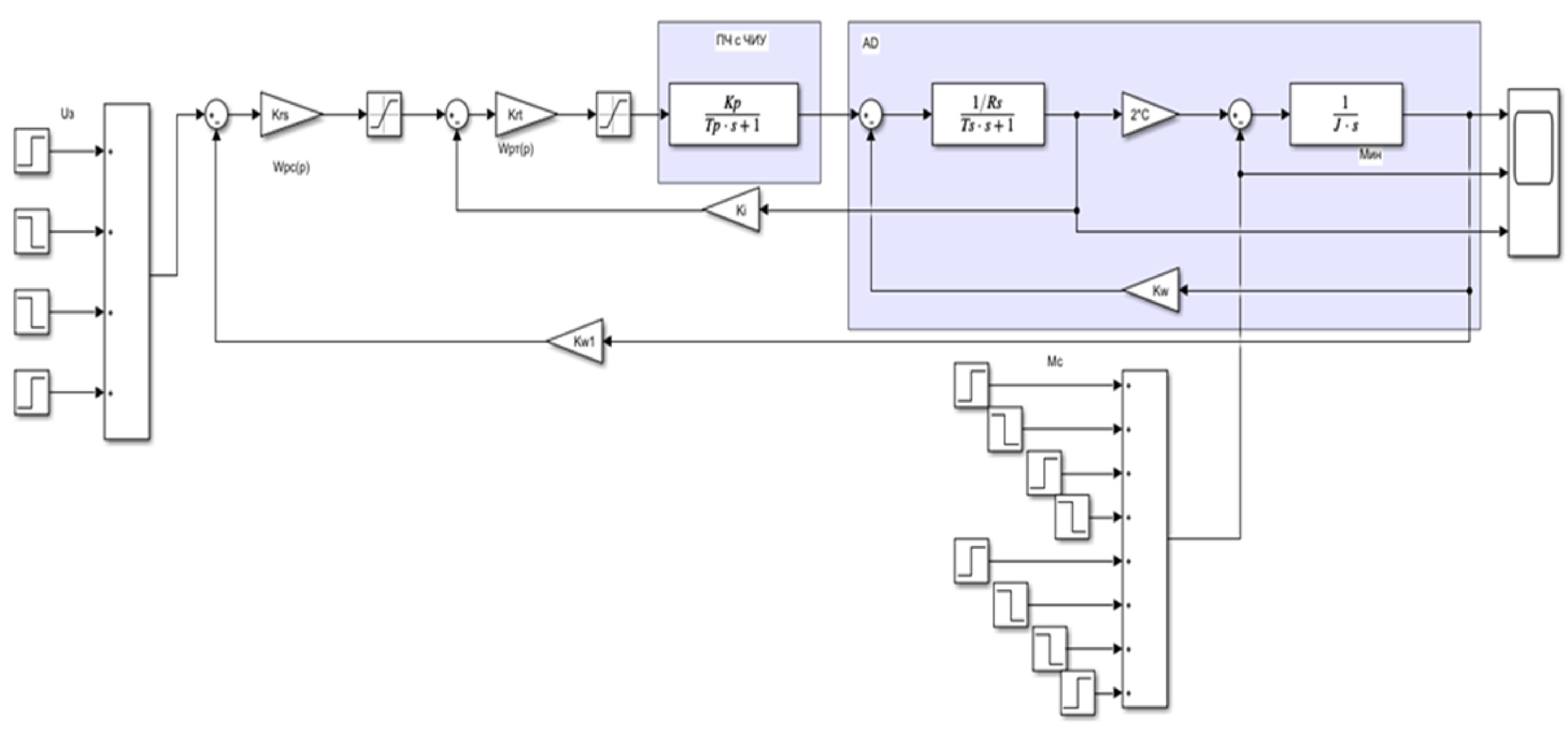 Рис. 4. Структурно-параметрическая модель электропривода подъема ковша шагающего экскаватора с частотно-импульсным управлением