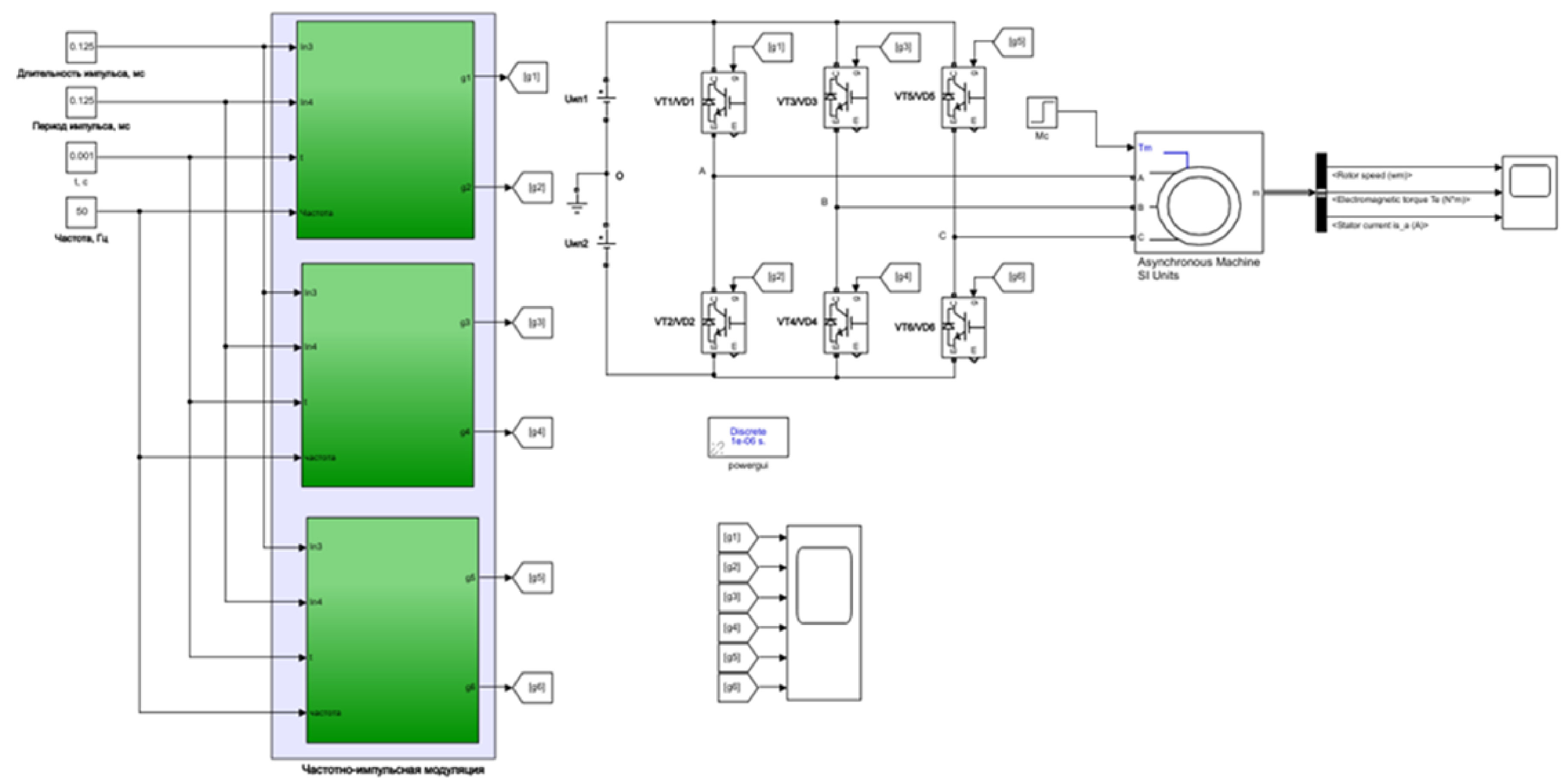 Используя формулы (7) и (8), можно описать цикл для формирования импульсов управления при ЧИУ. Чтобы получить график формирования импульсов при ЧИУ на полный период, удобно использовать программный пакет Matlab/Simulink.