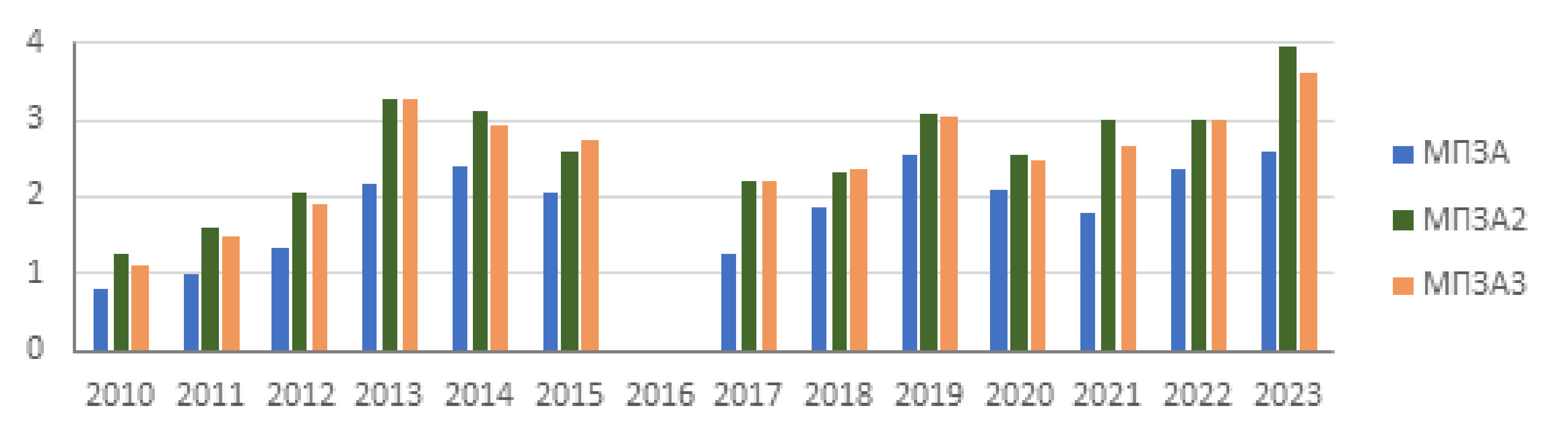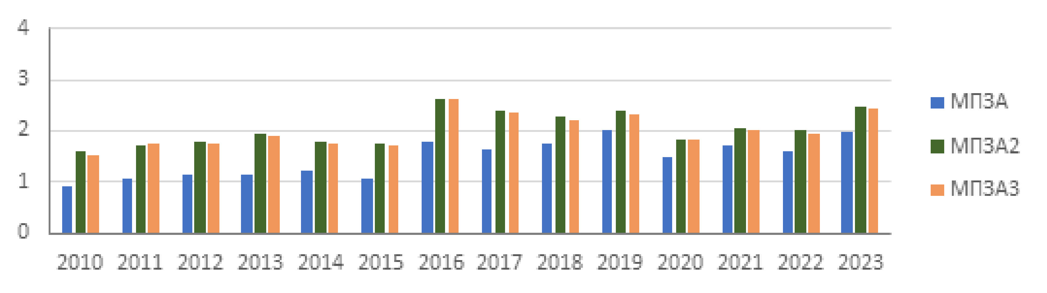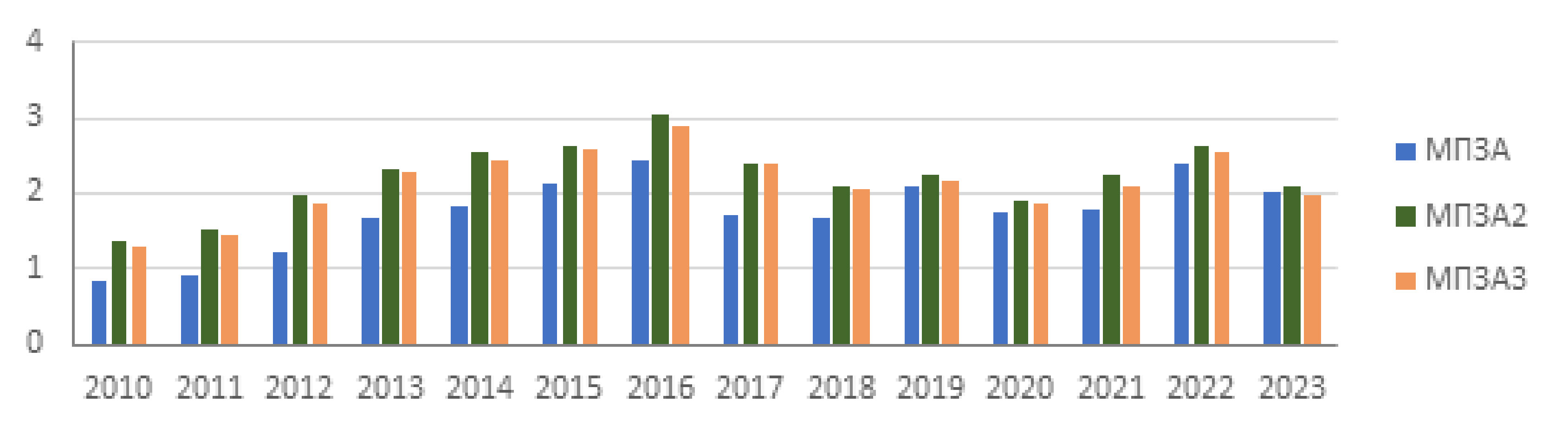 Как видно из рис. 6-8, что, начиная с 2012 г., значения МПЗА, МПЗА2, МПЗА3 превышают 0,8, что свидетельствует об отсутствии благоприятных условий для рассеивания ЗВ. Наблюдается также близость значений МПЗА2 и МПЗА3 для всех рассматриваемых городов. Поэтому можно при исследовании использовать более простой показатель МПЗА2 [23].