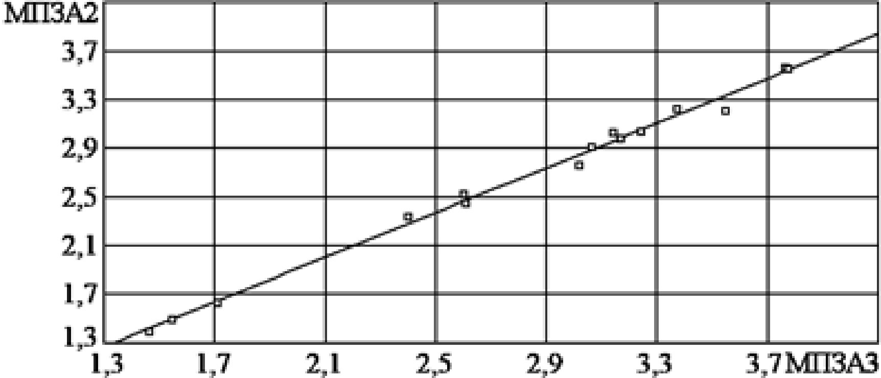 Рис. 10 и 11 свидетельствуют, что значения ПСА и 1/МПЗА достаточно близки. В работе [11] предлагается использовать вместо показателя ПСА величину 1/МПЗА, в формулу расчета которой входит меньшее число параметров. Проверим эту возможность на модели регрессии (2):