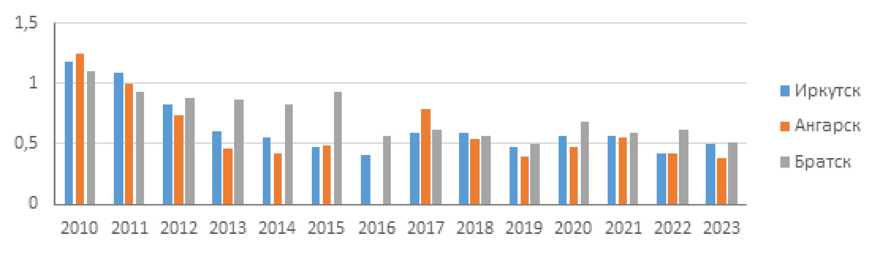 Заключение. Анализ полученных результатов показывает неутешительную статистику по чистоте атмосферы в городах ИО. С одной стороны, усиливается техногенное давление на атмосферные процессы, так как, по данным [25], индекс промышленного производства по Иркутской области с 2010 г. устойчиво держится свыше 100 %. С другой стороны, выявлено, что ослабевают ССА. Последнее подтверждается исследованиями [11]. Такие выводы актуализируют развитие экологически чистых технологий и экологических природовосстановительных программ.