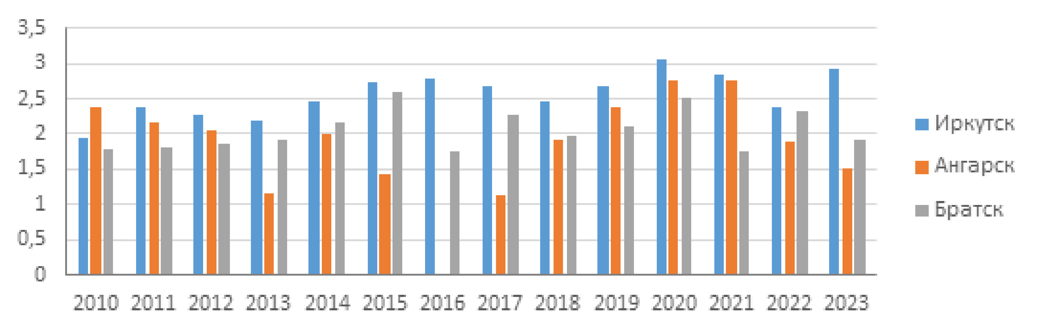 Среднегодовые метеорологические показатели загрязнения атмосферы (МПЗА, МПЗА2, МПЗА3, усовершенствованный УМПА) и показатель самоочищения атмосферы (ПСА, 1/МПЗА) Иркутска, Ангарска, Братска за период с 2010 по 2023 годы вычислялись по данным сайта [22] в созданной БД (СУБД MySQL). Объем обработанных метеорологических данных (строк в базе) составил для Ангарска – 33825, Братска – 40849, Иркутска – 40851. Среднегодовые значения исследуемых показателей находились в среднеинтегральном смысле, то есть в виде отношения накопленной суммы наблюдений соответствующих событий за все месяцы года к общему числу измерений в рассматриваемом году. Среднемесячные значения показателей также вычислялись в среднеинтегральном смысле, как отношение накопленной суммы наблюдений соответствующих событий за рассматриваемый месяц разных годов к общему числу измерений за это же время наблюдений.